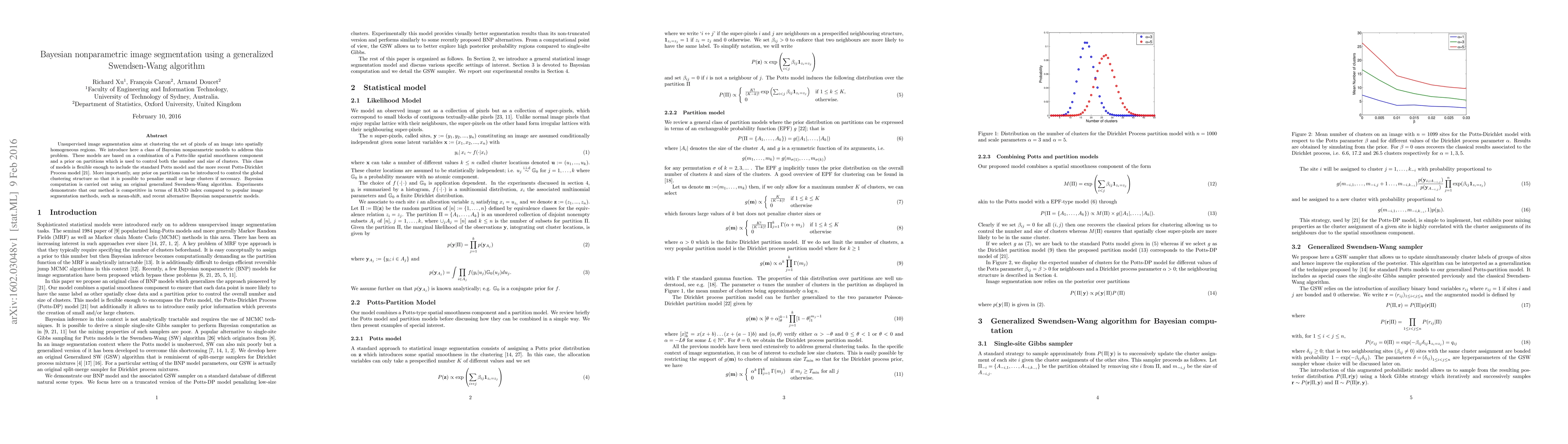 This paper proposes a Bayesian nonparametric model for unsupervised image segmentation, combining Potts-like spatial smoothness with a flexible partition prior to control cluster sizes. The method uses a generalized Swendsen-Wang algorithm for Bayesian computation, showing competitive performance in RAND index compared to mean-shift and other Bayesian nonparametric models.