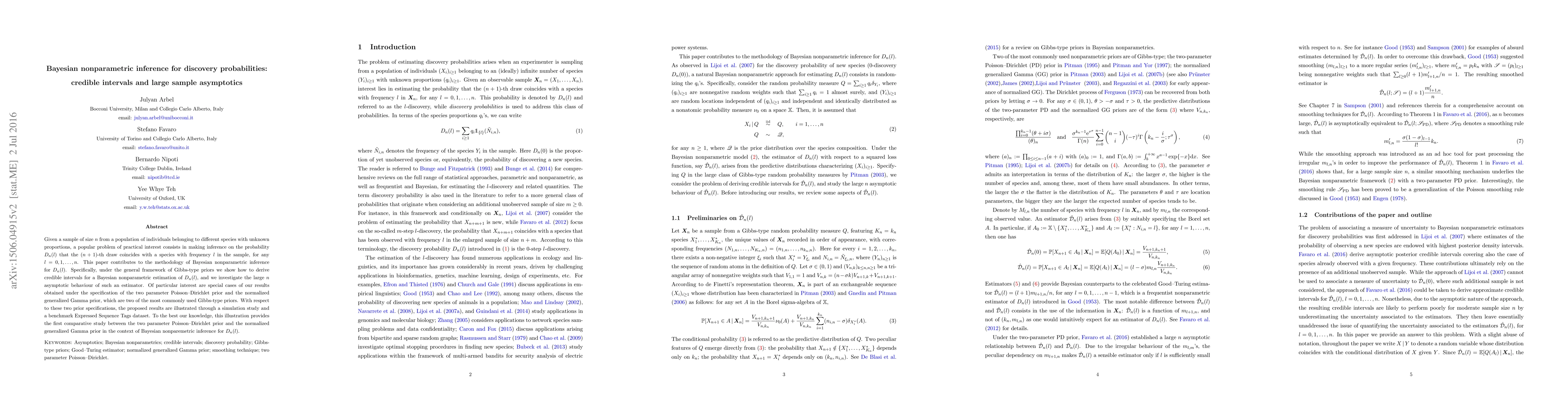 This paper develops Bayesian nonparametric inference methods to estimate discovery probabilities $D_{n}(l)$ for species in a population, deriving credible intervals and examining large sample asymptotics under Gibbs-type priors. It compares the two-parameter Poisson-Dirichlet and normalized generalized Gamma priors through simulations and a dataset analysis.
