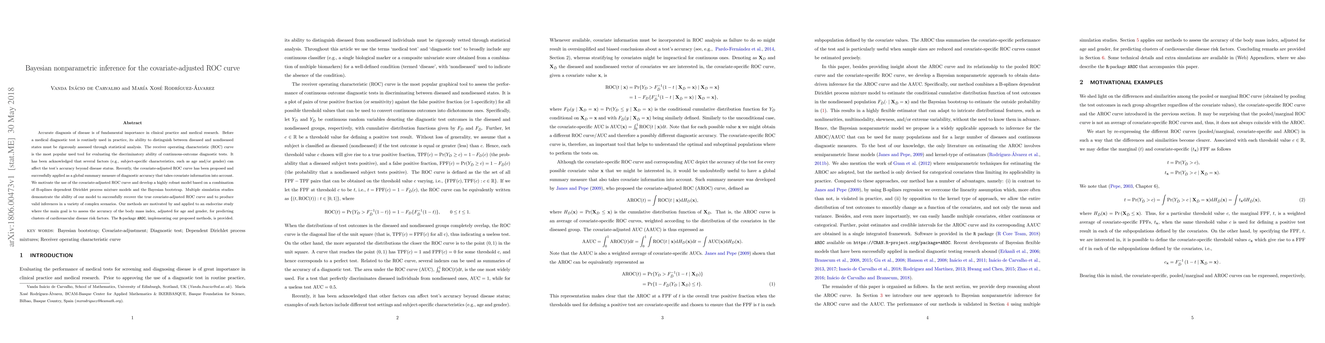 Accurate diagnosis of disease is of fundamental importance in clinical practice and medical research. Before a medical diagnostic test is routinely used in practice, its ability to distinguish between diseased and nondiseased states must be rigorously assessed through statistical analysis. The receiver operating characteristic (ROC) curve is the most popular used tool for evaluating the discriminatory ability of continuous-outcome diagnostic tests. It has been acknowledged that several factors (e.g., subject-specific characteristics, such as age and/or gender) can affect the test's accuracy beyond disease status. Recently, the covariate-adjusted ROC curve has been proposed and successfully applied as a global summary measure of diagnostic accuracy that takes covariate information into account. We motivate the use of the covariate-adjusted ROC curve and develop a highly robust model based on a combination of B-splines dependent Dirichlet process mixture models and the Bayesian bootstrap. Multiple simulation studies demonstrate the ability of our model to successfully recover the true covariate-adjusted ROC curve and to produce valid inferences in a variety of complex scenarios. Our methods are motivated by and applied to an endocrine study where the main goal is to assess the accuracy of the body mass index, adjusted for age and gender, for predicting clusters of cardiovascular disease risk factors. The R-package AROC, implementing our proposed methods, is provided.