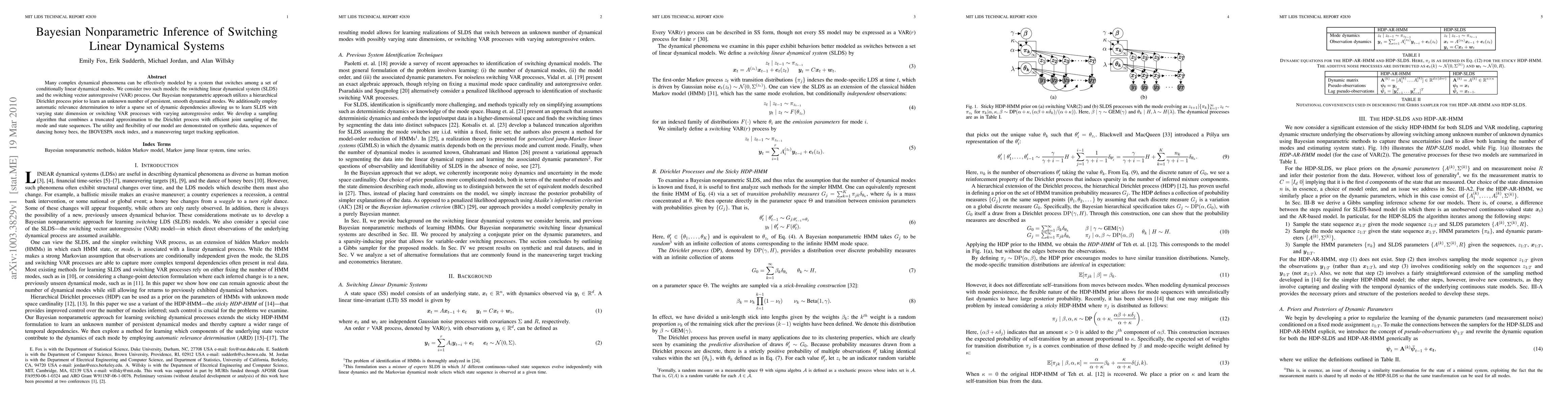 This paper proposes a Bayesian nonparametric approach for modeling switching linear dynamical systems using a hierarchical Dirichlet process to infer the number of dynamical modes, and employs automatic relevance determination for sparse dynamic dependencies. The method is demonstrated on various applications including stock index data and target tracking.