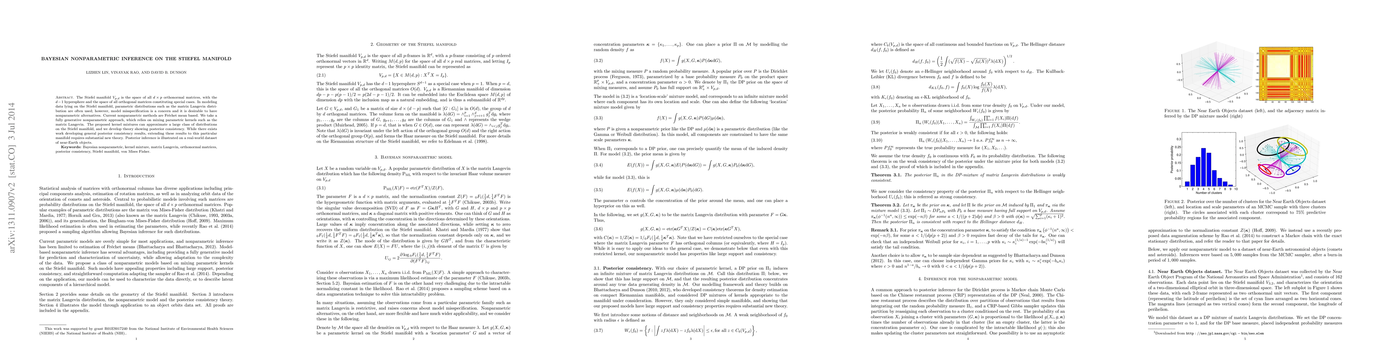 This paper proposes a Bayesian nonparametric method for inference on the Stiefel manifold using kernel mixtures of parametric distributions, demonstrating posterior consistency and applying it to a dataset of near-Earth objects. The approach provides a flexible alternative to traditional parametric models, addressing model misspecification concerns.