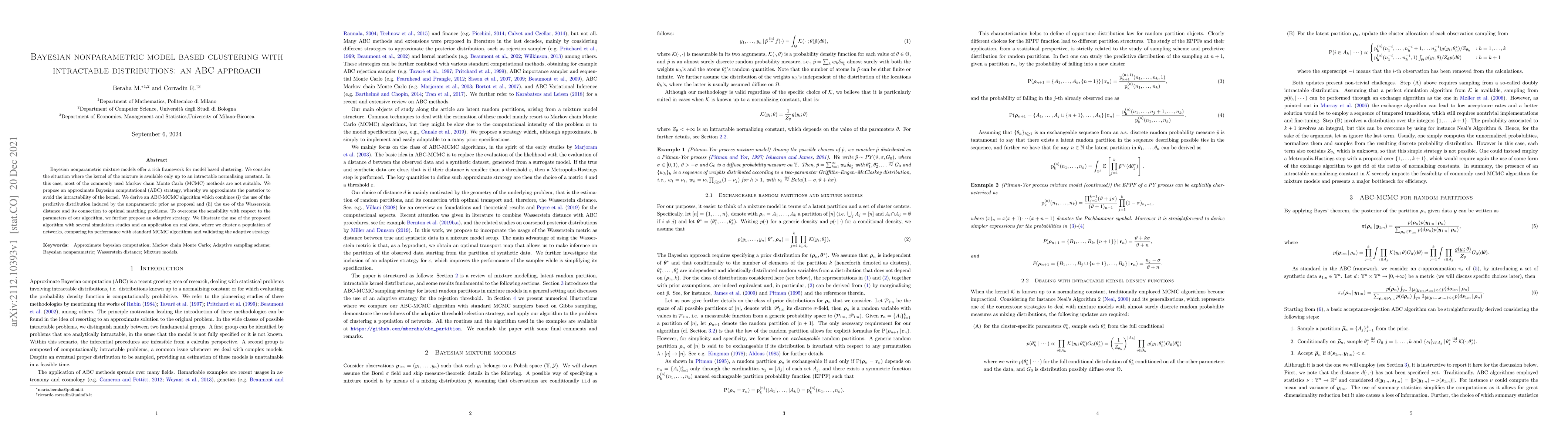 Researchers propose a new approach to Bayesian nonparametric clustering using Approximate Bayesian Computation (ABC) to handle intractable distributions, offering improved performance over traditional Markov chain Monte Carlo methods.