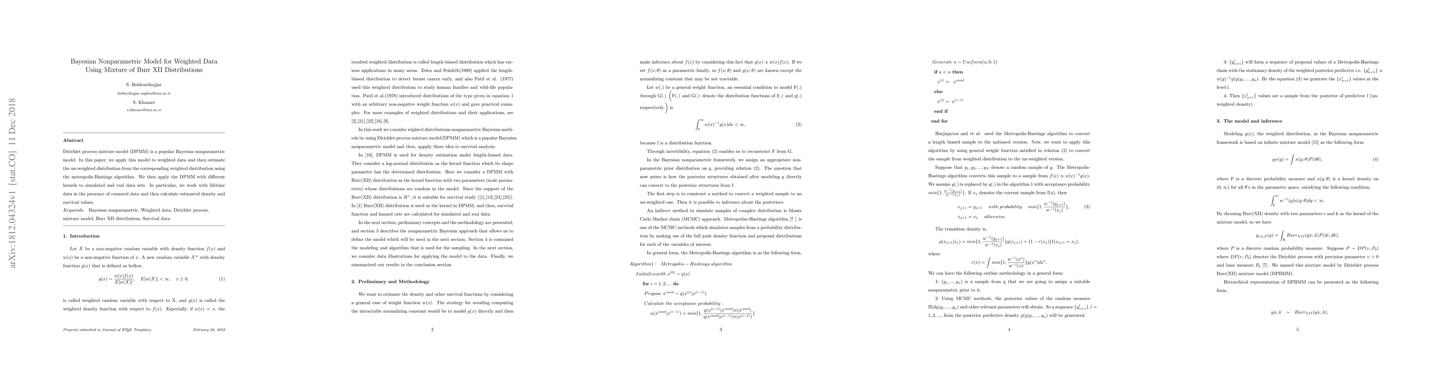This paper applies a Dirichlet process mixture model to weighted data, estimating the unweighted distribution via the metropolis-Hastings algorithm. It evaluates the model's performance on both simulated and real lifetime datasets, particularly handling censored data to calculate density and survival values.
