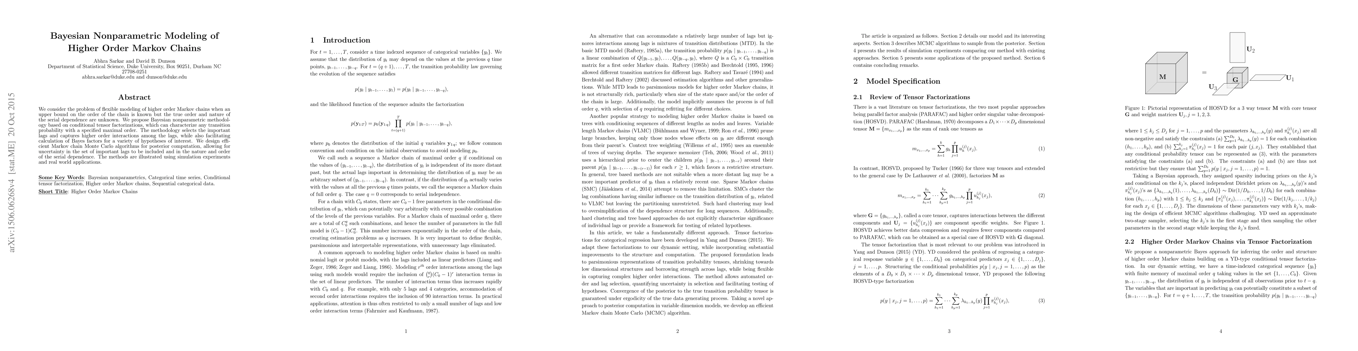 This paper proposes Bayesian nonparametric methods for modeling higher order Markov chains with unknown true order, using conditional tensor factorizations. The methodology selects significant lags and captures higher-order interactions, and includes efficient MCMC algorithms for posterior computation, demonstrated through simulations and real-world applications.