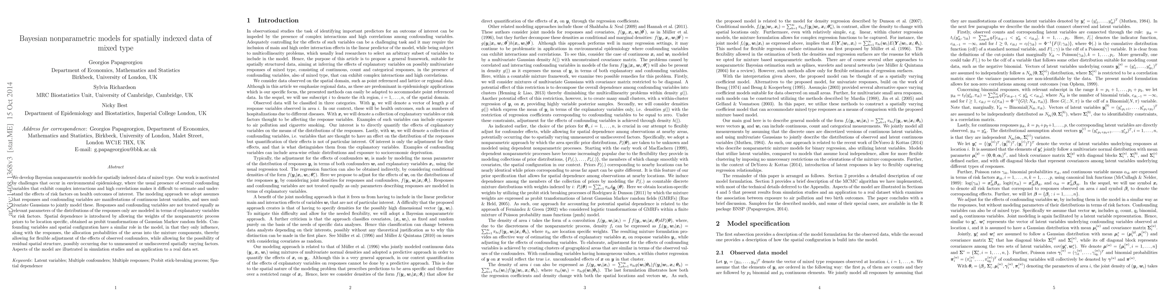 A new Bayesian nonparametric model is introduced to analyze spatially indexed data with mixed types, allowing for flexible adjustment of confounding variables and residual spatial structure.
