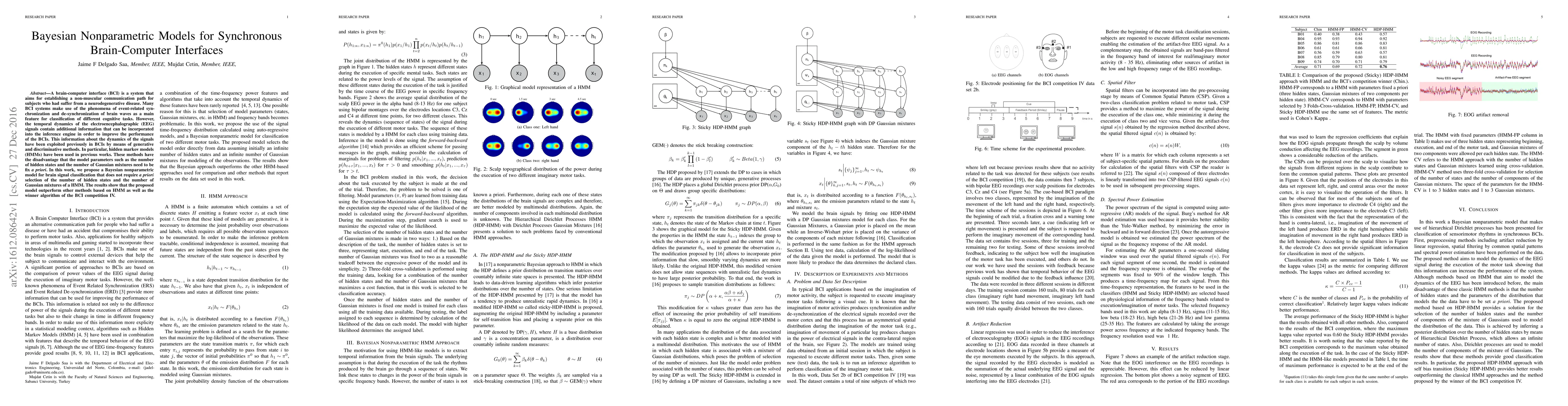 This paper proposes a Bayesian nonparametric model for classifying brain signals in BCIs, eliminating the need for "a priori" selection of hidden states and Gaussian mixtures. The results demonstrate superior performance compared to traditional hidden Markov models and the BCI competition IV winner algorithm.