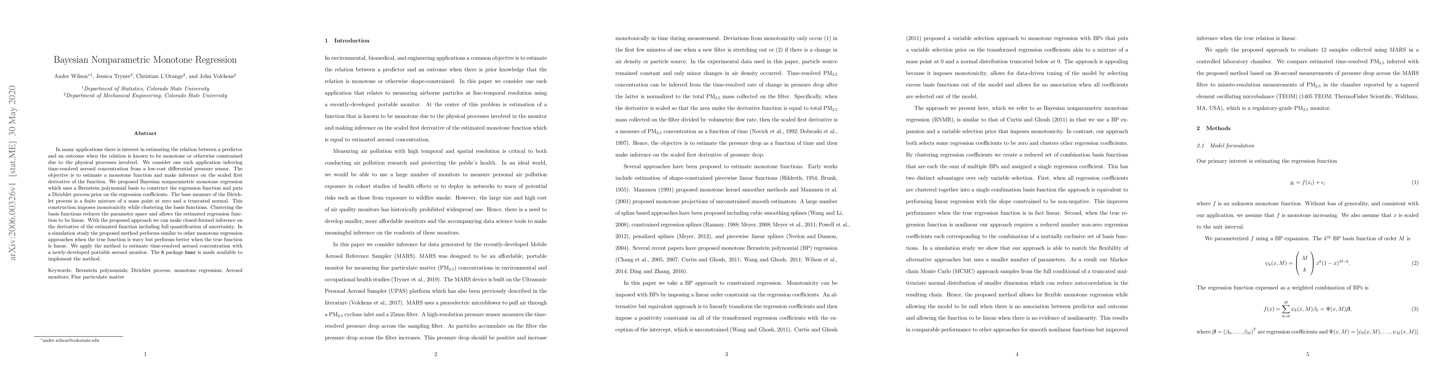 This paper proposes a Bayesian nonparametric monotone regression method using Bernstein polynomials and a Dirichlet process prior to estimate monotone relationships, particularly for inferring time-resolved aerosol concentration from sensor data. The method effectively clusters basis functions to reduce parameter space and allows for closed-form inference on the function's derivative, outperforming other methods in linear scenarios.