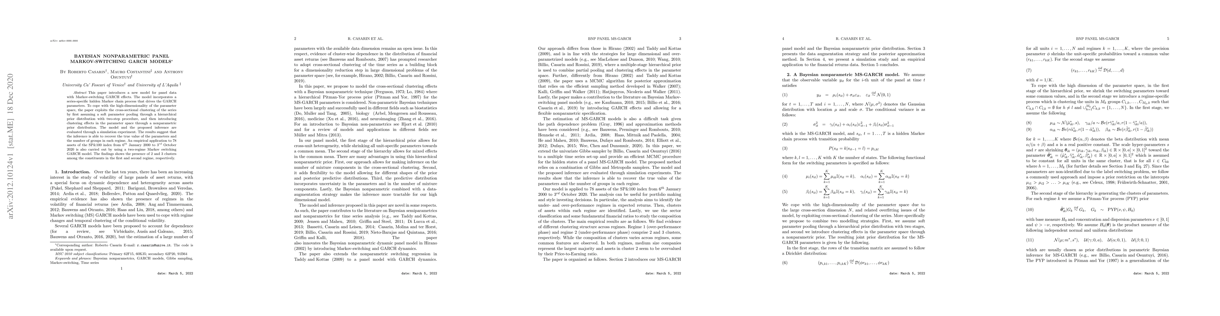 This paper introduces a new model for panel data with Markov-switching GARCH effects. The model incorporates a series-specific hidden Markov chain process that drives the GARCH parameters. To cope with the high-dimensionality of the parameter space, the paper exploits the cross-sectional clustering of the series by first assuming a soft parameter pooling through a hierarchical prior distribution with two-step procedure, and then introducing clustering effects in the parameter space through a nonparametric prior distribution. The model and the proposed inference are evaluated through a simulation experiment. The results suggest that the inference is able to recover the true value of the parameters and the number of groups in each regime. An empirical application to 78 assets of the SP\&100 index from $6^{th}$ January 2000 to $3^{rd}$ October 2020 is also carried out by using a two-regime Markov switching GARCH model. The findings shows the presence of 2 and 3 clusters among the constituents in the first and second regime, respectively.