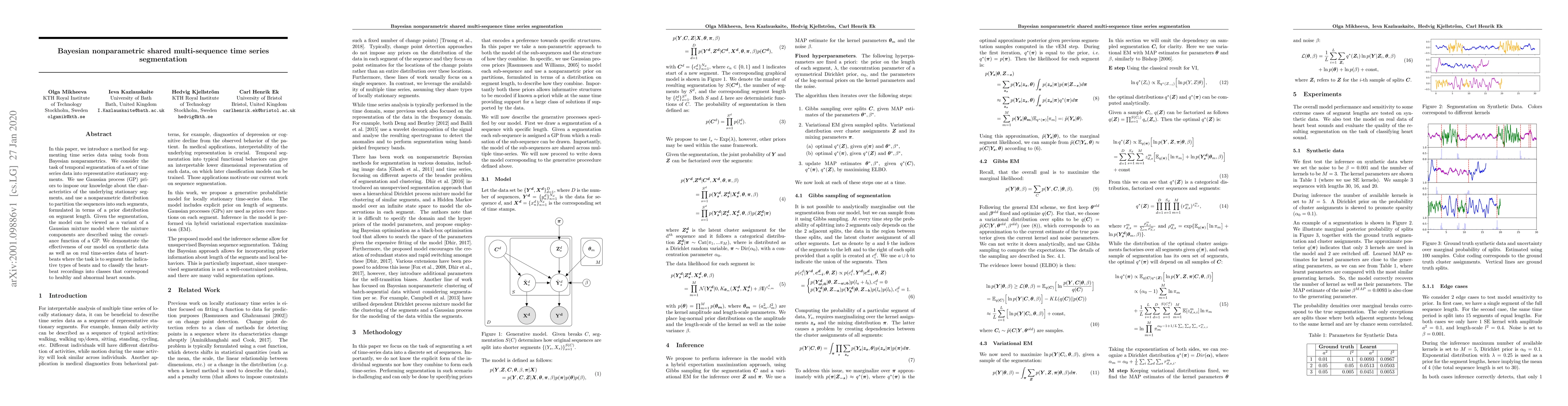 This paper proposes a Bayesian nonparametric method for segmenting multi-sequence time series data into stationary segments using Gaussian process priors and a nonparametric distribution. The model is demonstrated on synthetic and real heartbeat data to segment and classify heart sounds.