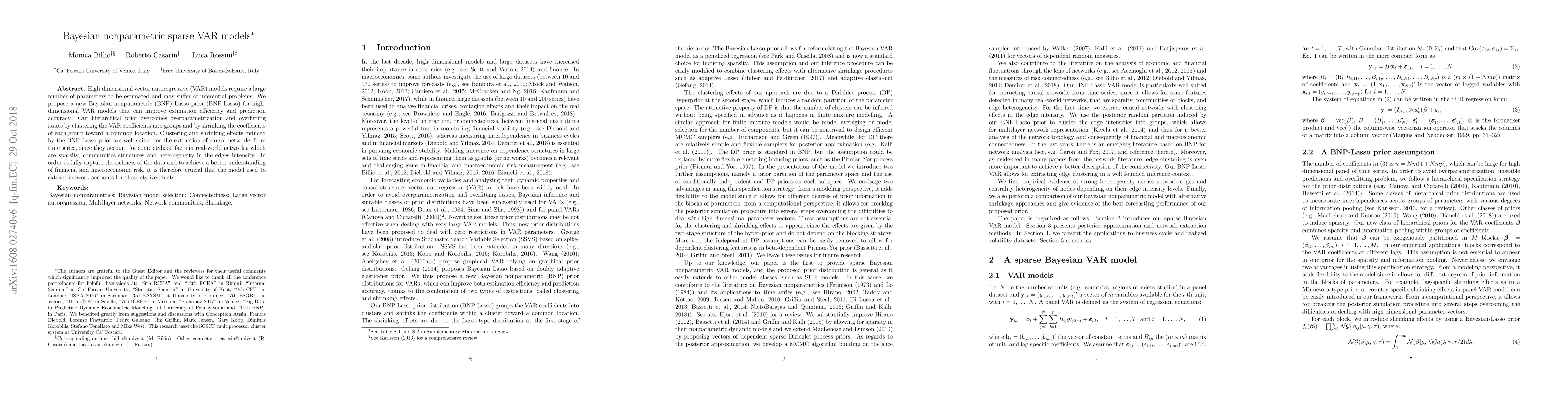 High dimensional vector autoregressive (VAR) models require a large number of parameters to be estimated and may suffer of inferential problems. We propose a new Bayesian nonparametric (BNP) Lasso prior (BNP-Lasso) for high-dimensional VAR models that can improve estimation efficiency and prediction accuracy. Our hierarchical prior overcomes overparametrization and overfitting issues by clustering the VAR coefficients into groups and by shrinking the coefficients of each group toward a common location. Clustering and shrinking effects induced by the BNP-Lasso prior are well suited for the extraction of causal networks from time series, since they account for some stylized facts in real-world networks, which are sparsity, communities structures and heterogeneity in the edges intensity. In order to fully capture the richness of the data and to achieve a better understanding of financial and macroeconomic risk, it is therefore crucial that the model used to extract network accounts for these stylized facts.