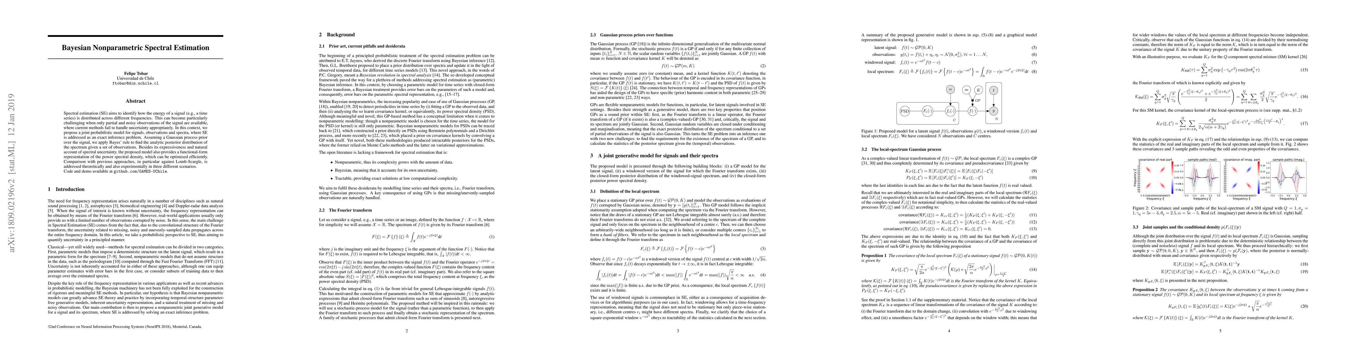 This paper proposes a Bayesian nonparametric method for spectral estimation, addressing uncertainty in noisy observations of signals, and providing an efficient optimization framework for power spectral density representation.