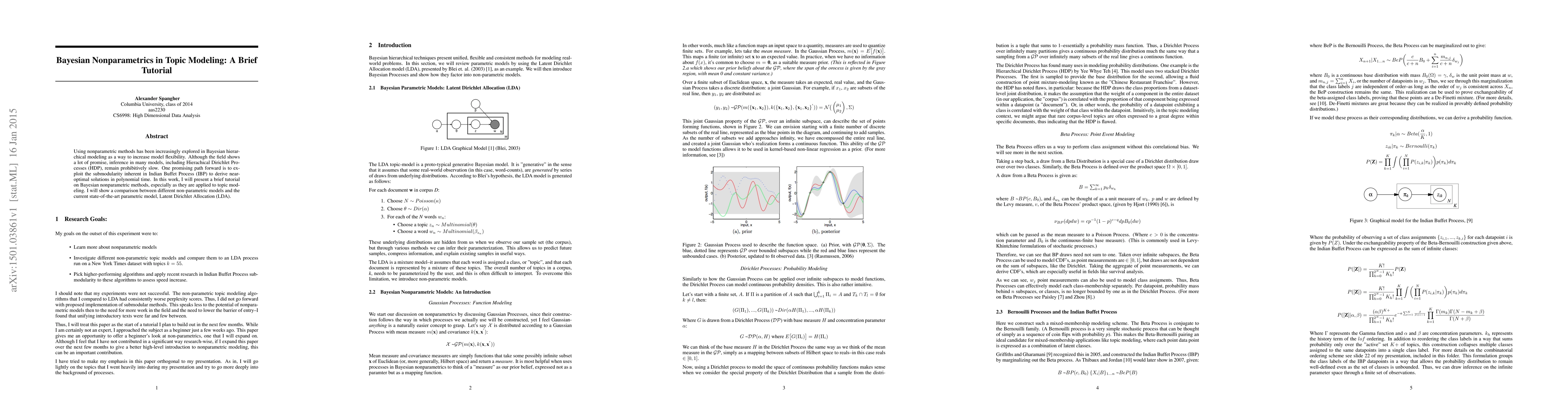 This paper provides a tutorial on Bayesian nonparametric methods for topic modeling, focusing on the flexibility they offer compared to traditional models. It highlights the computational challenges of methods like HDP and proposes the use of the Indian Buffet Process for near-optimal solutions, offering a comparative analysis with Latent Dirichlet Allocation (LDA).