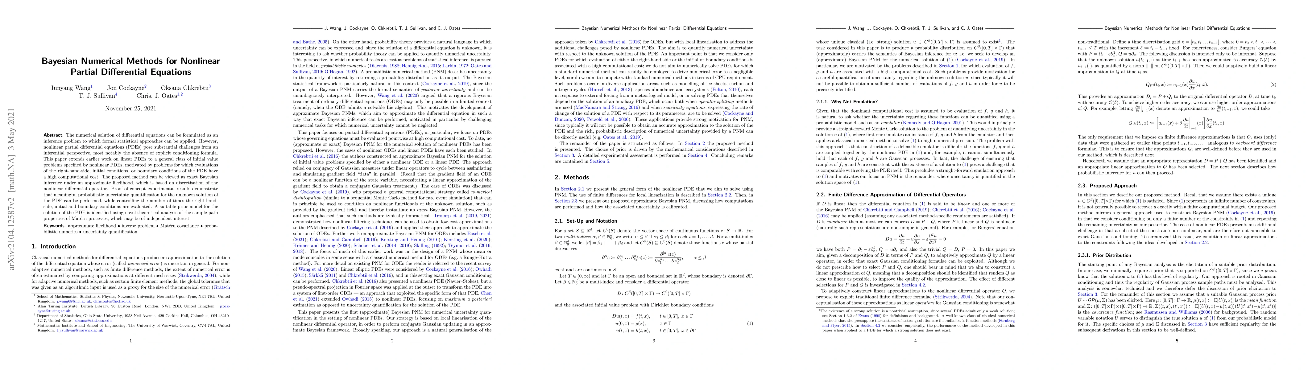 This paper proposes a Bayesian numerical method for solving nonlinear partial differential equations (PDEs) by framing the problem as an inference task, allowing for probabilistic uncertainty quantification. The method approximates the likelihood based on discretized differential operators, reducing computational costs by minimizing evaluations of the PDE's right-hand-side and boundary conditions.