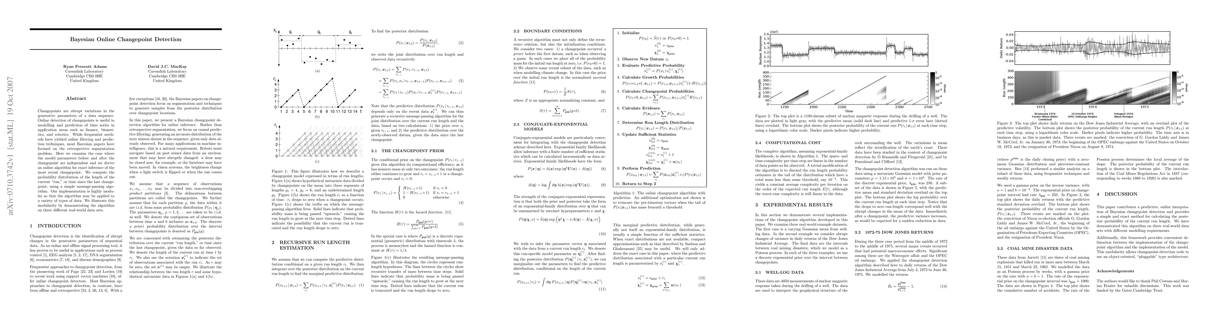 This paper proposes a Bayesian online algorithm for detecting changepoints in data streams, focusing on the most recent changepoint. It employs a modular approach for exact inference and demonstrates its effectiveness on various real-world datasets in finance, biometrics, and robotics.