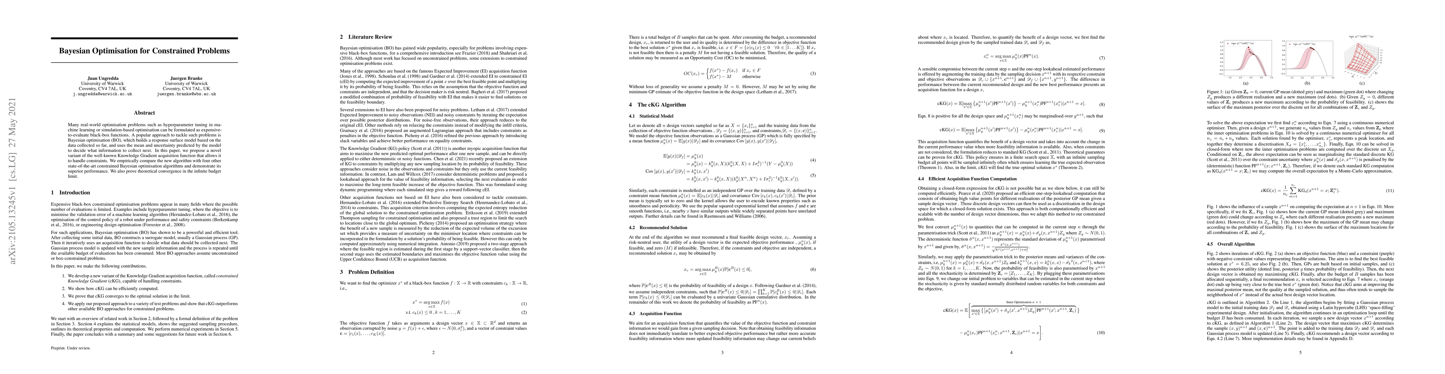 This paper introduces a new constrained variant of the Knowledge Gradient acquisition function for Bayesian optimisation, showing superior empirical performance and theoretical convergence in comparison to four other state-of-the-art algorithms.
