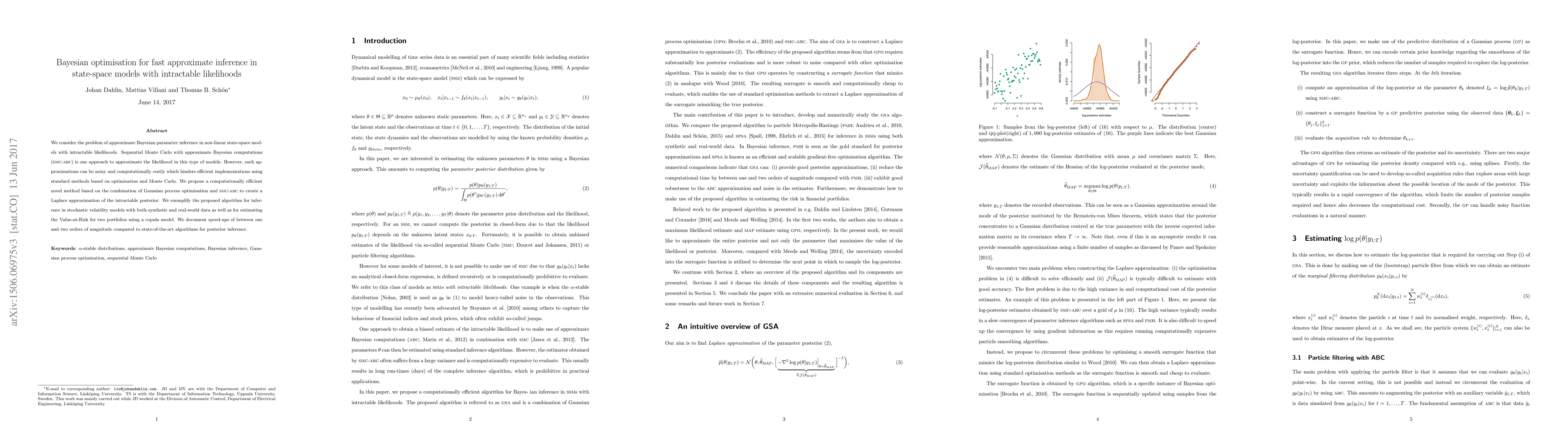This paper proposes a novel method combining Bayesian optimisation and Sequential Monte Carlo with approximate Bayesian computations (SMC-ABC) to efficiently approximate posterior distributions in non-linear state-space models with intractable likelihoods. The method achieves significant speed-ups, up to two orders of magnitude, compared to existing algorithms for posterior inference.