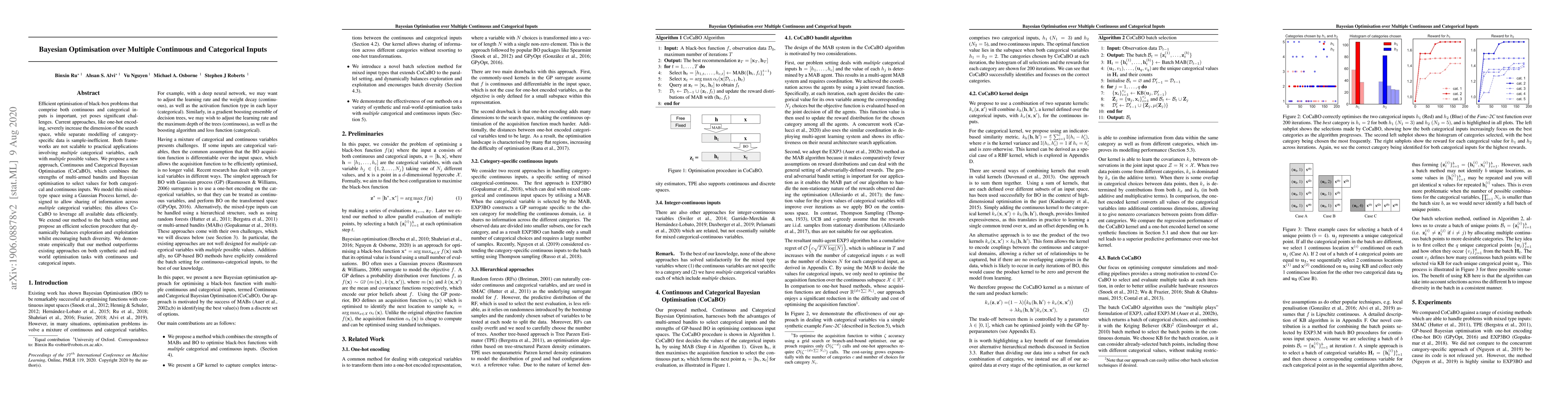 The paper introduces CoCaBO, a novel Bayesian optimisation method that efficiently handles black-box problems with mixed continuous and categorical inputs. It combines multi-armed bandit and Bayesian optimisation techniques, leveraging a Gaussian Process kernel to share information across categorical variables, and outperforms existing methods in both synthetic and real-world optimisation tasks.
