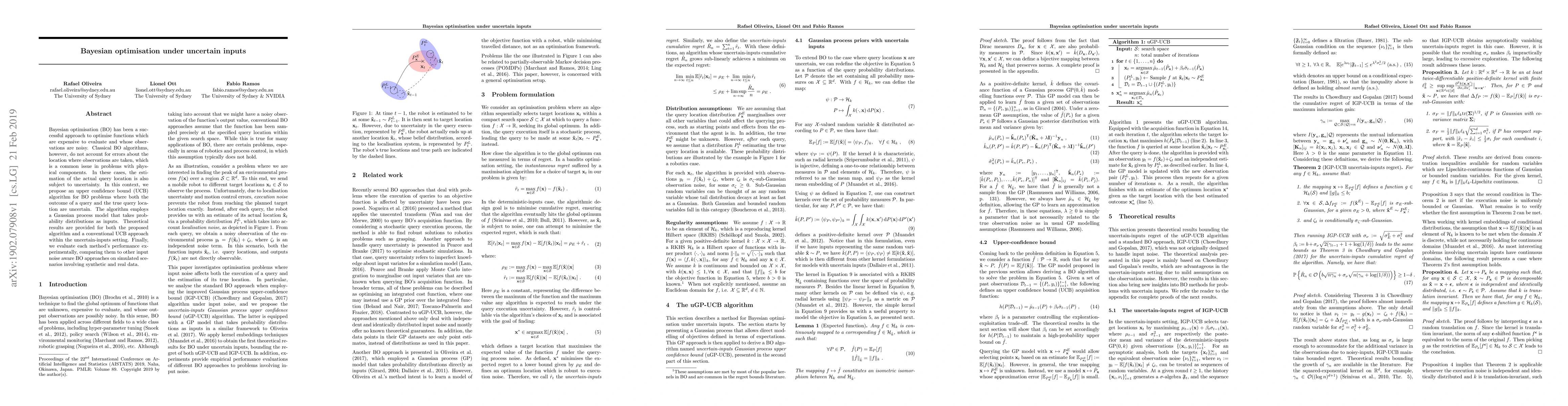 This paper proposes a novel upper confidence bound (UCB) algorithm for Bayesian optimisation under uncertain inputs, addressing the common issue of errors in the location of observations in physical problems. The algorithm uses a Gaussian process model that accommodates input uncertainties, and is theoretically and experimentally compared against conventional methods and other input noise aware BO approaches.