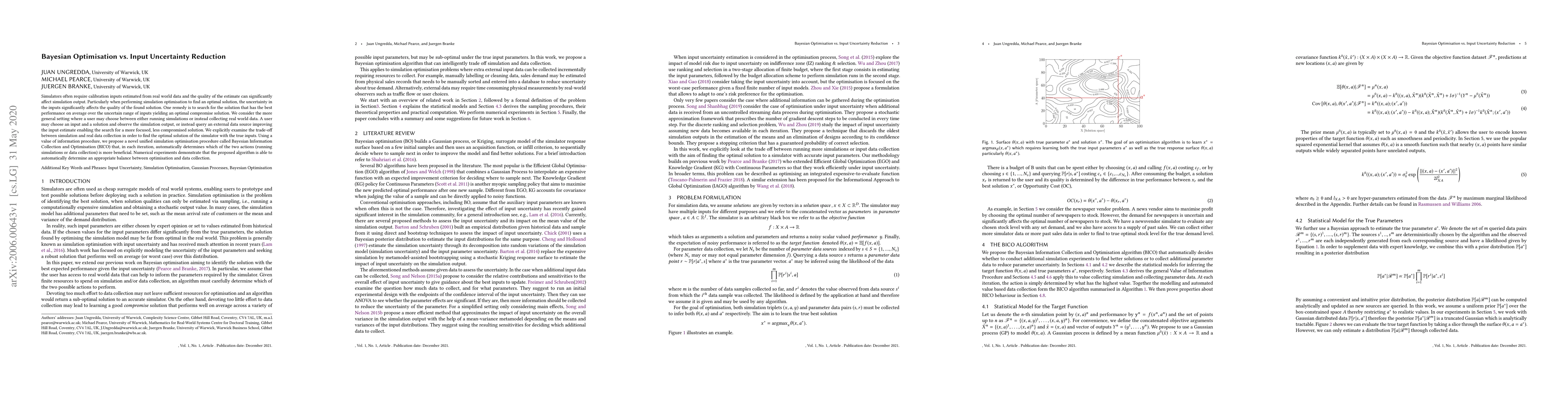 This paper compares Bayesian optimisation with input uncertainty reduction, proposing a novel method called Bayesian Information Collection and Optimisation (BICO) to determine when to run simulations versus collecting real-world data for optimal calibration. The BICO method effectively balances simulation runs and data collection to find the best compromise solution.