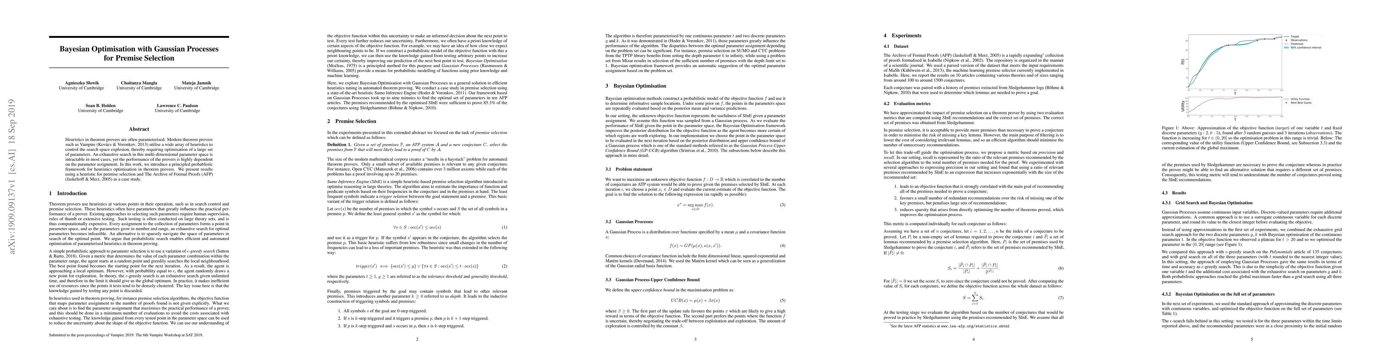 Heuristics in theorem provers are often parameterised. Modern theorem provers such as Vampire utilise a wide array of heuristics to control the search space explosion, thereby requiring optimisation of a large set of parameters. An exhaustive search in this multi-dimensional parameter space is intractable in most cases, yet the performance of the provers is highly dependent on the parameter assignment. In this work, we introduce a principled probablistic framework for heuristics optimisation in theorem provers. We present results using a heuristic for premise selection and The Archive of Formal Proofs (AFP) as a case study.
