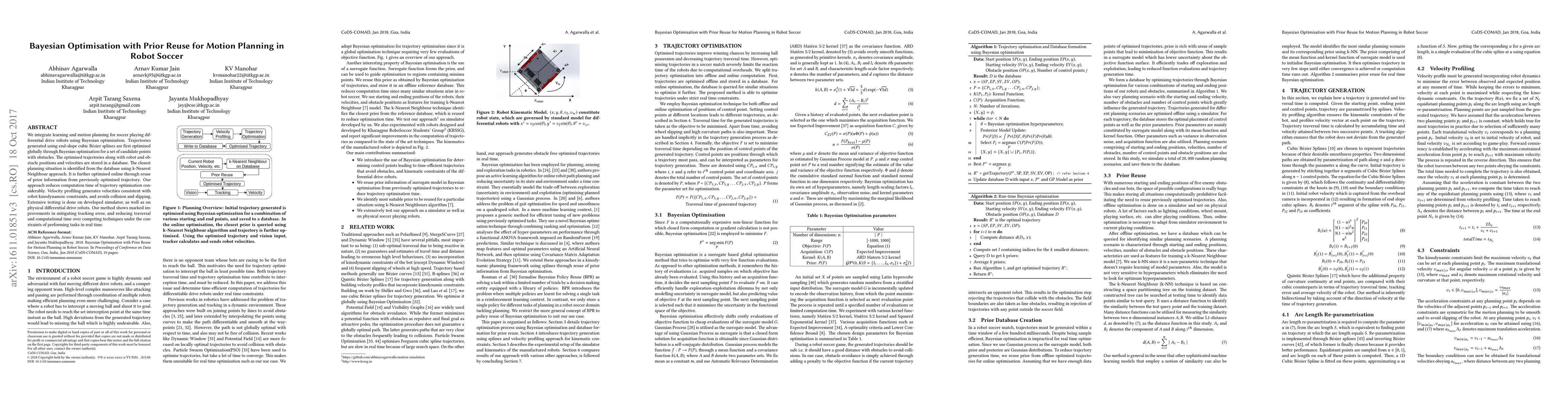 This paper proposes a Bayesian optimisation method for motion planning in robot soccer, using prior reuse to optimise trajectories efficiently. The approach reduces computation time and improves trajectory tracking accuracy by leveraging optimised prior trajectories and velocity profiling within kinematic constraints.