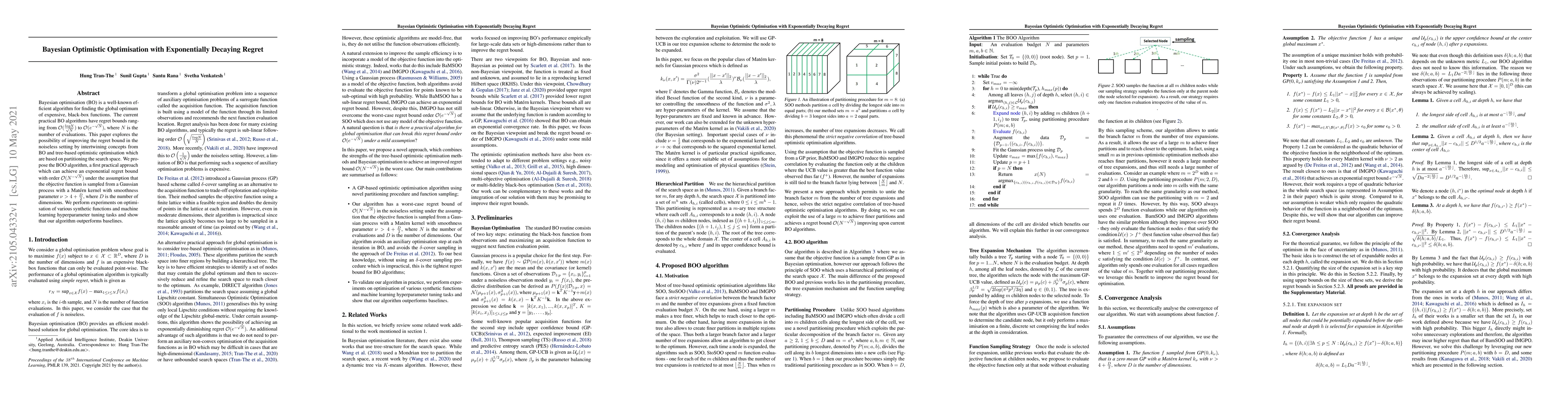 This paper proposes the BOO algorithm for Bayesian optimisation, achieving an exponential regret bound of $\mathcal O(N^{-\sqrt{N}})$. Experiments demonstrate its superior performance over baselines in synthetic function optimisation and machine learning hyperparameter tuning.