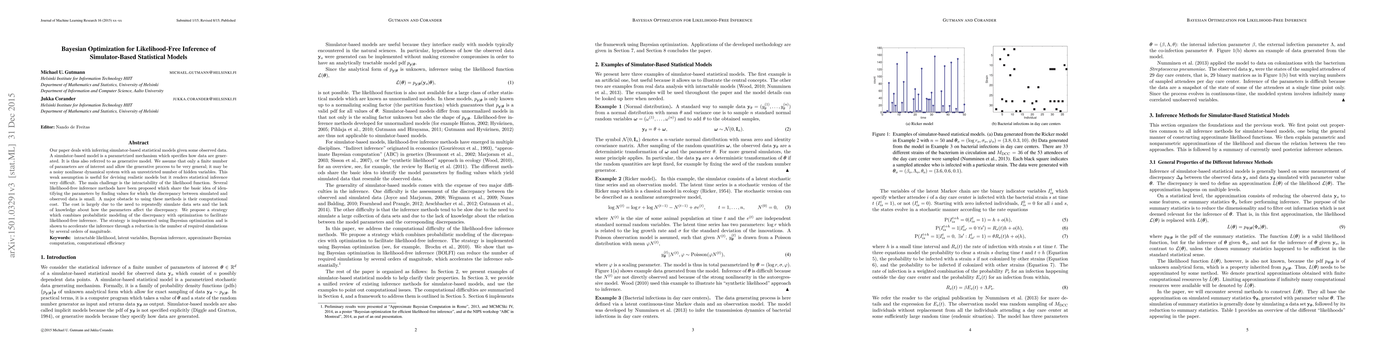 This paper proposes a Bayesian optimization approach for likelihood-free inference in simulator-based statistical models, addressing the computational challenge of simulating data and reducing the number of required simulations by orders of magnitude. The method leverages probabilistic modeling to efficiently identify parameters that minimize the discrepancy between simulated and observed data.