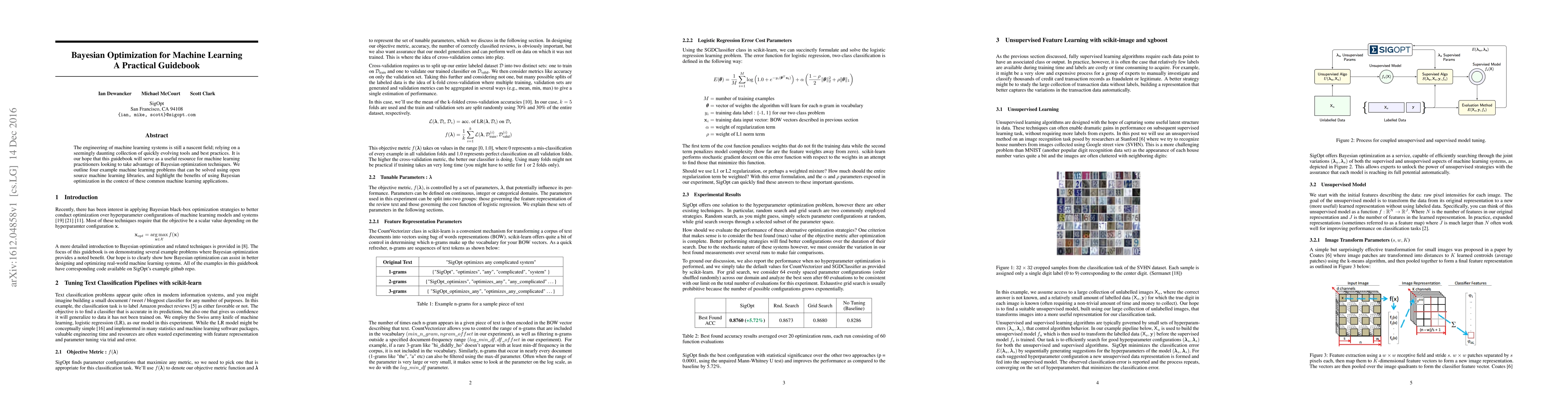 This guidebook provides a practical introduction to Bayesian optimization for machine learning practitioners, focusing on its application to four common machine learning problems using open source libraries. It emphasizes the benefits of Bayesian optimization in enhancing the efficiency and effectiveness of machine learning systems.