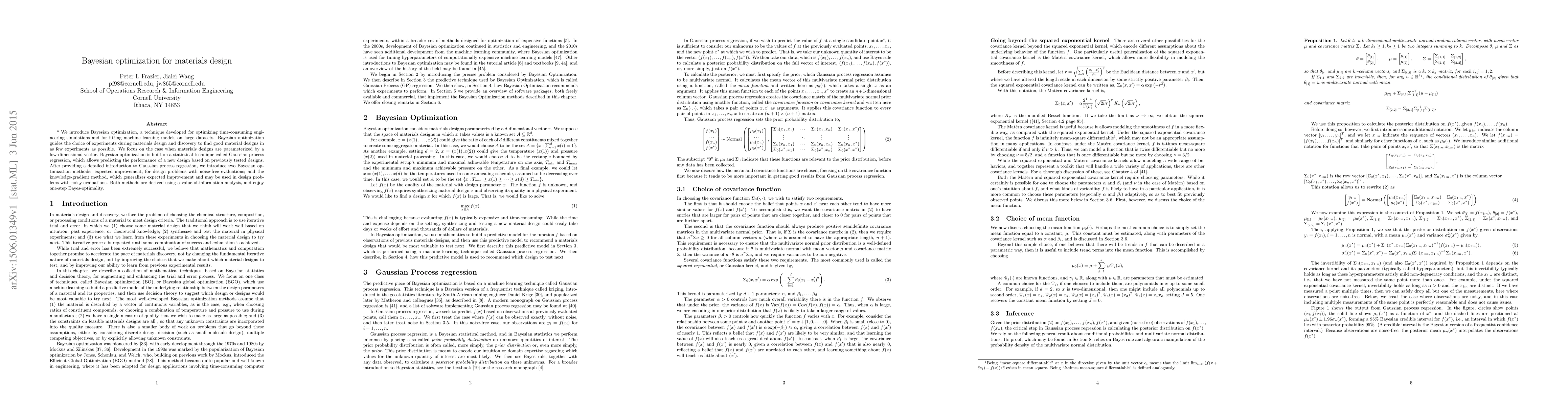 We introduce Bayesian optimization, a technique developed for optimizing time-consuming engineering simulations and for fitting machine learning models on large datasets. Bayesian optimization guides the choice of experiments during materials design and discovery to find good material designs in as few experiments as possible. We focus on the case when materials designs are parameterized by a low-dimensional vector. Bayesian optimization is built on a statistical technique called Gaussian process regression, which allows predicting the performance of a new design based on previously tested designs. After providing a detailed introduction to Gaussian process regression, we introduce two Bayesian optimization methods: expected improvement, for design problems with noise-free evaluations; and the knowledge-gradient method, which generalizes expected improvement and may be used in design problems with noisy evaluations. Both methods are derived using a value-of-information analysis, and enjoy one-step Bayes-optimality.