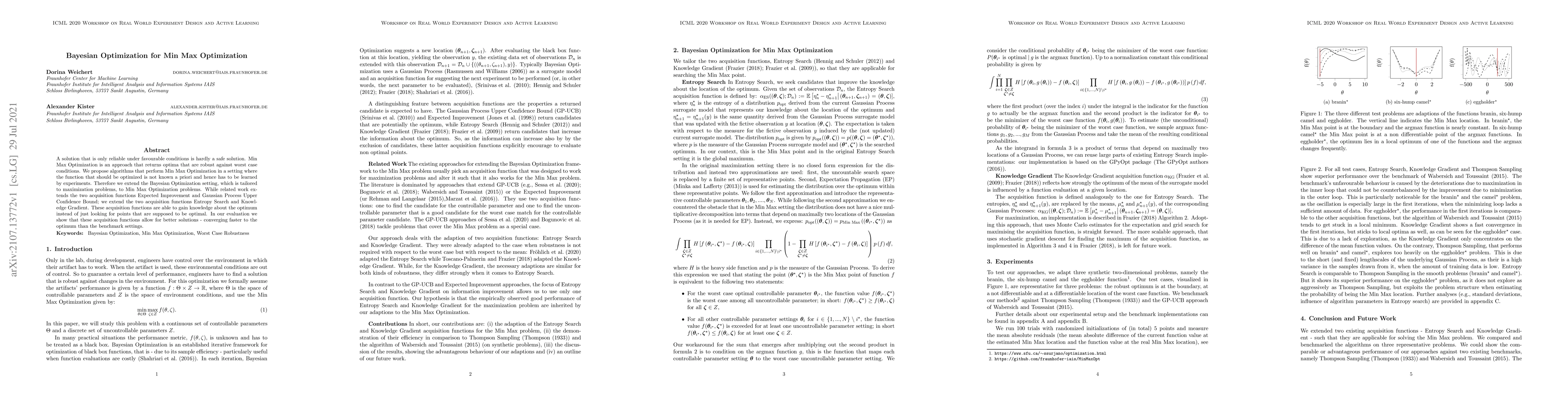 This paper proposes algorithms for Bayesian Optimization tailored to Min Max Optimization, where the goal is to find solutions robust against worst-case conditions. The authors extend Bayesian Optimization to learn unknown functions through experiments, incorporating acquisition functions like Entropy Search and Knowledge Gradient to converge faster to robust optima compared to benchmarks.