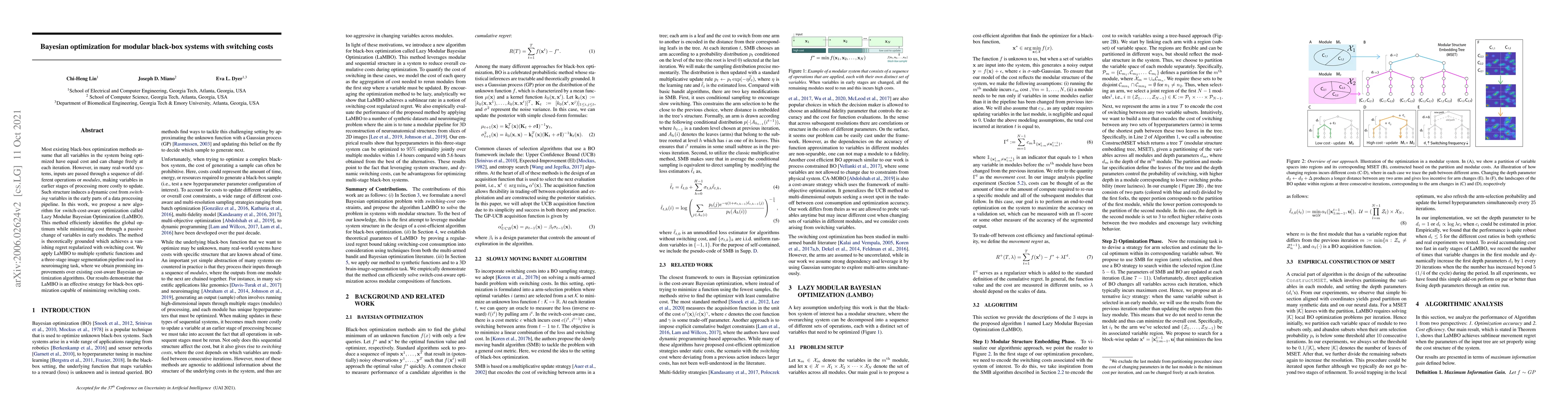 This paper introduces Lazy Modular Bayesian Optimization (LaMBO), a novel algorithm for optimizing modular black-box systems with switching costs, achieving global optima while minimizing the cost of changing variables in early stages. LaMBO demonstrates promising improvements over existing methods in both synthetic functions and a neuroscience-based image segmentation pipeline.