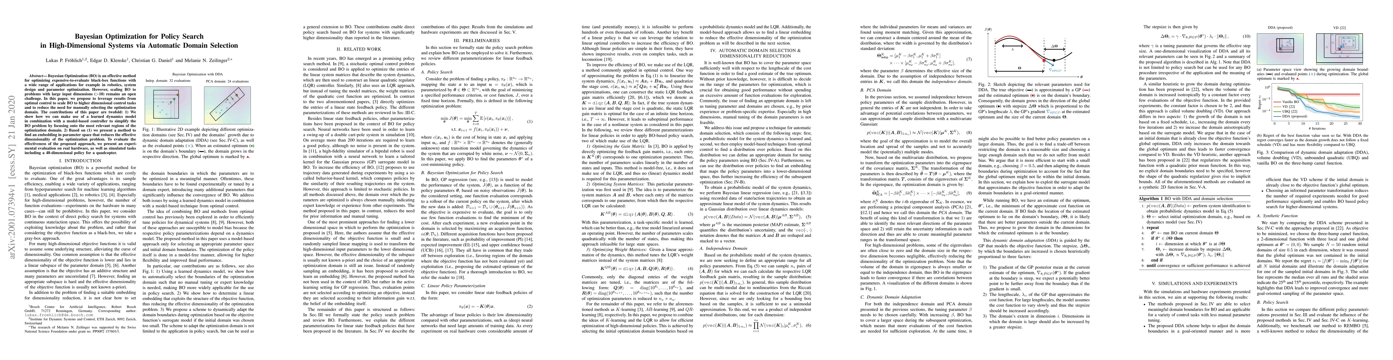 Bayesian Optimization (BO) is an effective method for optimizing expensive-to-evaluate black-box functions with a wide range of applications for example in robotics, system design and parameter optimization. However, scaling BO to problems with large input dimensions (>10) remains an open challenge. In this paper, we propose to leverage results from optimal control to scale BO to higher dimensional control tasks and to reduce the need for manually selecting the optimization domain. The contributions of this paper are twofold: 1) We show how we can make use of a learned dynamics model in combination with a model-based controller to simplify the BO problem by focusing onto the most relevant regions of the optimization domain. 2) Based on (1) we present a method to find an embedding in parameter space that reduces the effective dimensionality of the optimization problem. To evaluate the effectiveness of the proposed approach, we present an experimental evaluation on real hardware, as well as simulated tasks including a 48-dimensional policy for a quadcopter.
