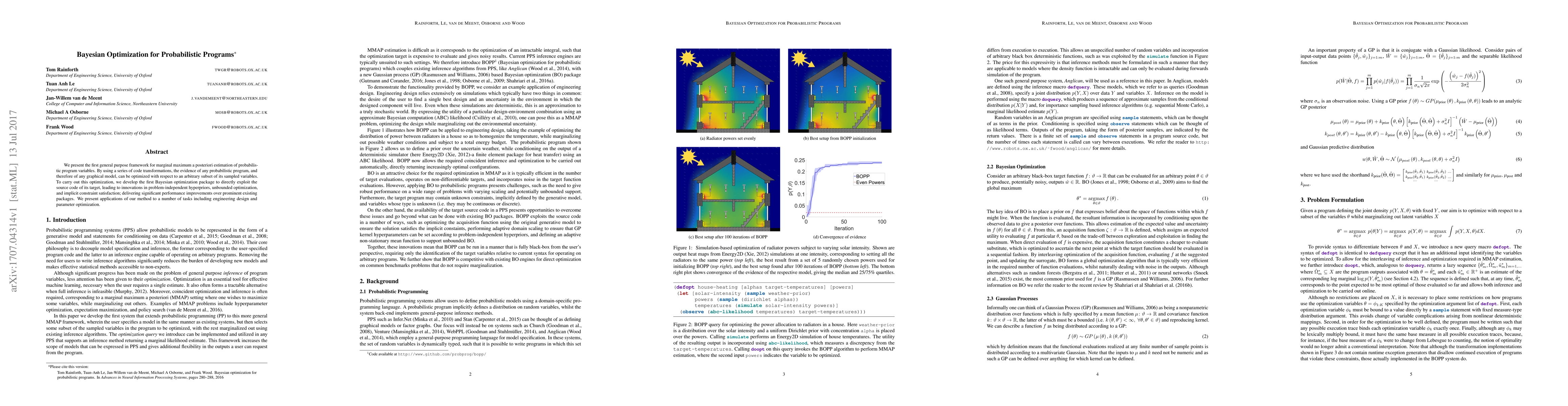We present the first general purpose framework for marginal maximum a posteriori estimation of probabilistic program variables. By using a series of code transformations, the evidence of any probabilistic program, and therefore of any graphical model, can be optimized with respect to an arbitrary subset of its sampled variables. To carry out this optimization, we develop the first Bayesian optimization package to directly exploit the source code of its target, leading to innovations in problem-independent hyperpriors, unbounded optimization, and implicit constraint satisfaction; delivering significant performance improvements over prominent existing packages. We present applications of our method to a number of tasks including engineering design and parameter optimization.