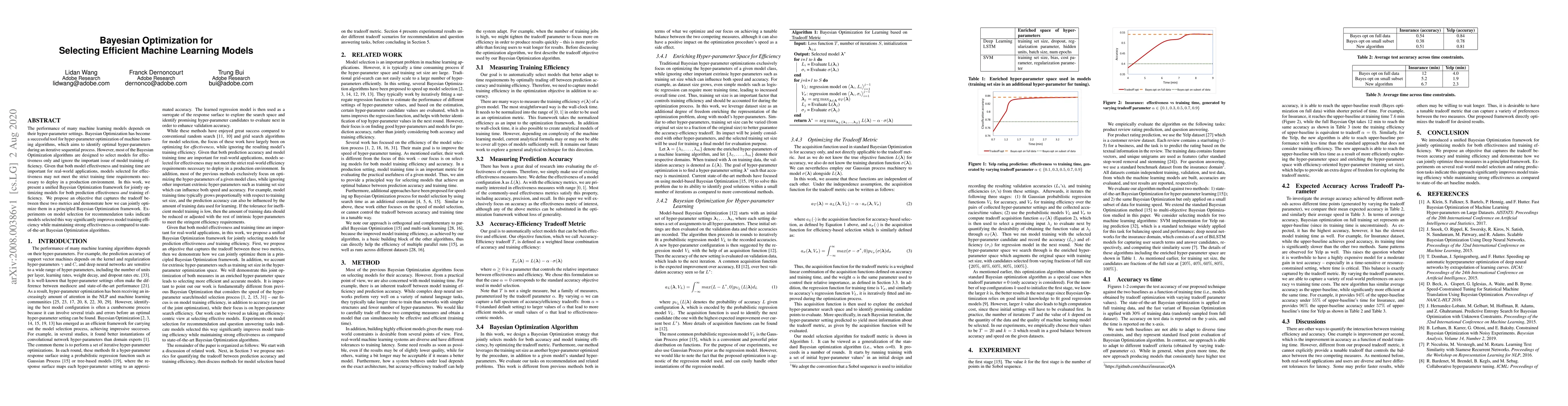This paper introduces a Bayesian Optimization framework that jointly optimizes machine learning models for both prediction effectiveness and training efficiency. The proposed method effectively balances these two critical metrics, leading to improved model training efficiency in recommendation tasks without sacrificing performance.