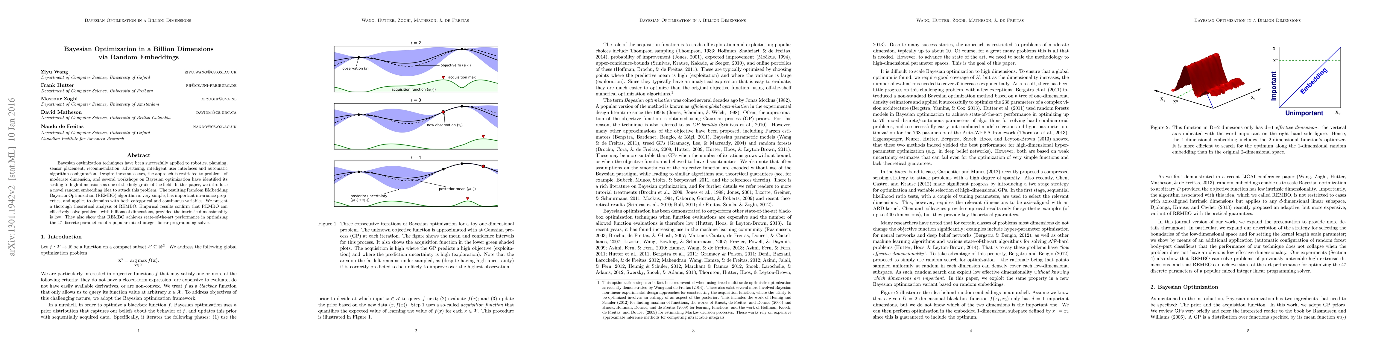 Researchers introduce a new method called REMBO that uses random embeddings to solve complex optimization problems with billions of dimensions, achieving state-of-the-art performance in certain applications.