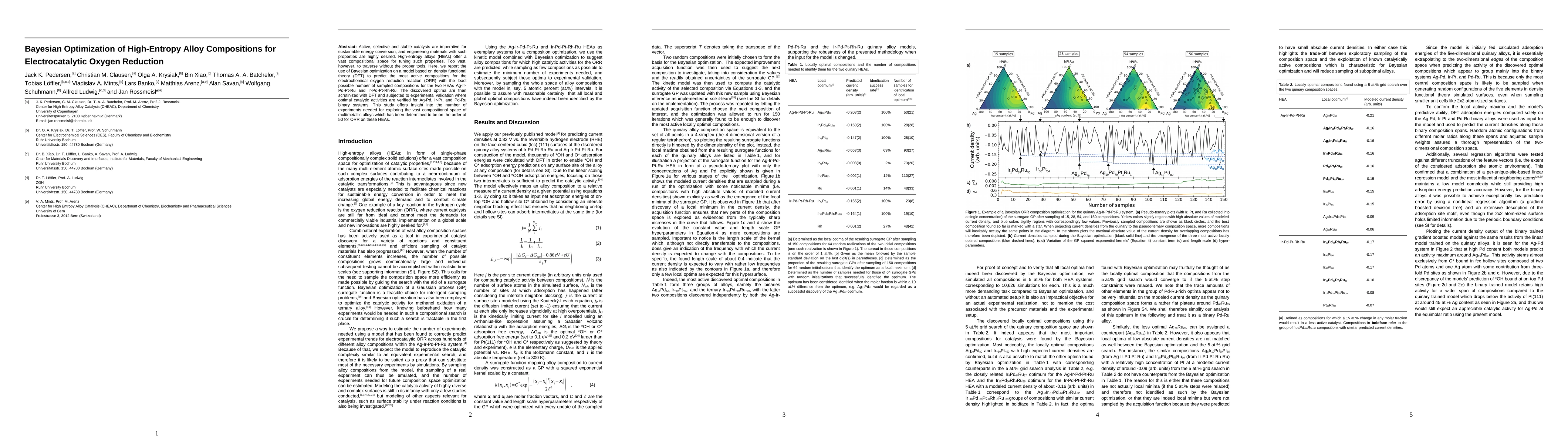 This paper employs Bayesian optimization based on density functional theory to efficiently identify optimal high-entropy alloy compositions for the electrocatalytic oxygen reduction reaction, significantly reducing the number of experimental trials needed. Experimental validation confirms the predicted optimal catalytic activities for specific binary systems.