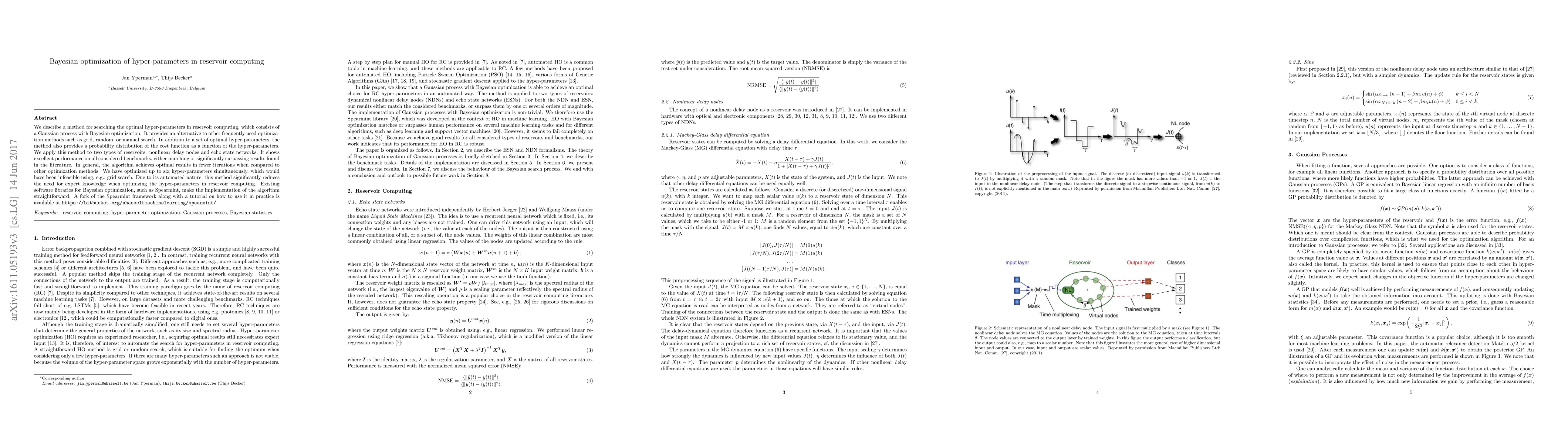 We describe a method for searching the optimal hyper-parameters in reservoir computing, which consists of a Gaussian process with Bayesian optimization. It provides an alternative to other frequently used optimization methods such as grid, random, or manual search. In addition to a set of optimal hyper-parameters, the method also provides a probability distribution of the cost function as a function of the hyper-parameters. We apply this method to two types of reservoirs: nonlinear delay nodes and echo state networks. It shows excellent performance on all considered benchmarks, either matching or significantly surpassing results found in the literature. In general, the algorithm achieves optimal results in fewer iterations when compared to other optimization methods. We have optimized up to six hyper-parameters simultaneously, which would have been infeasible using, e.g., grid search. Due to its automated nature, this method significantly reduces the need for expert knowledge when optimizing the hyper-parameters in reservoir computing. Existing software libraries for Bayesian optimization, such as Spearmint, make the implementation of the algorithm straightforward. A fork of the Spearmint framework along with a tutorial on how to use it in practice is available at https://bitbucket.org/uhasseltmachinelearning/spearmint/