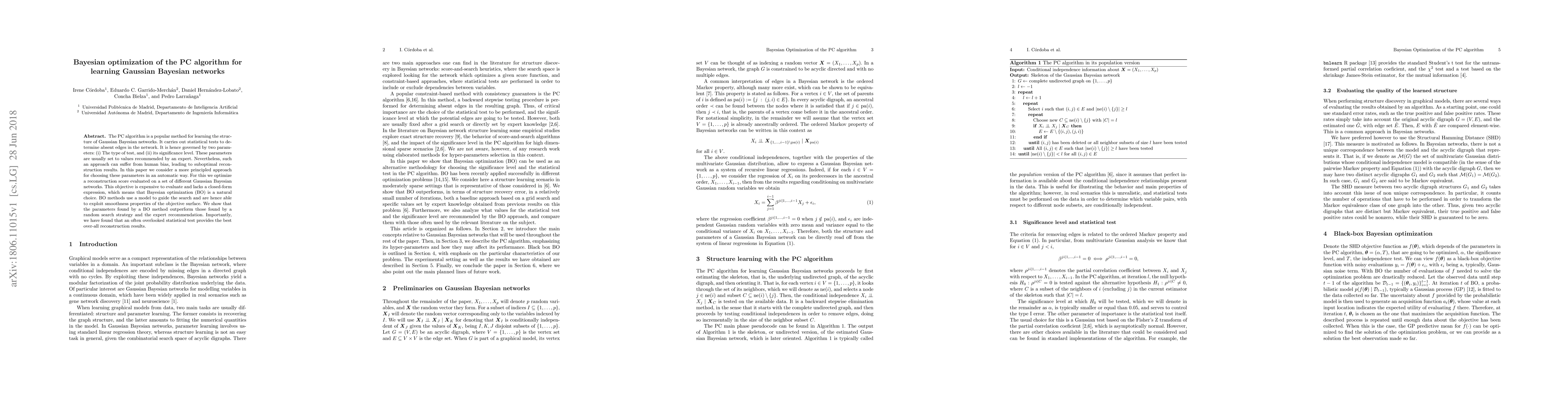 This paper proposes using Bayesian optimization to automatically select parameters for the PC algorithm in learning Gaussian Bayesian networks, achieving better reconstruction results than expert recommendations or random search. An often overlooked statistical test was found to yield the best overall performance.