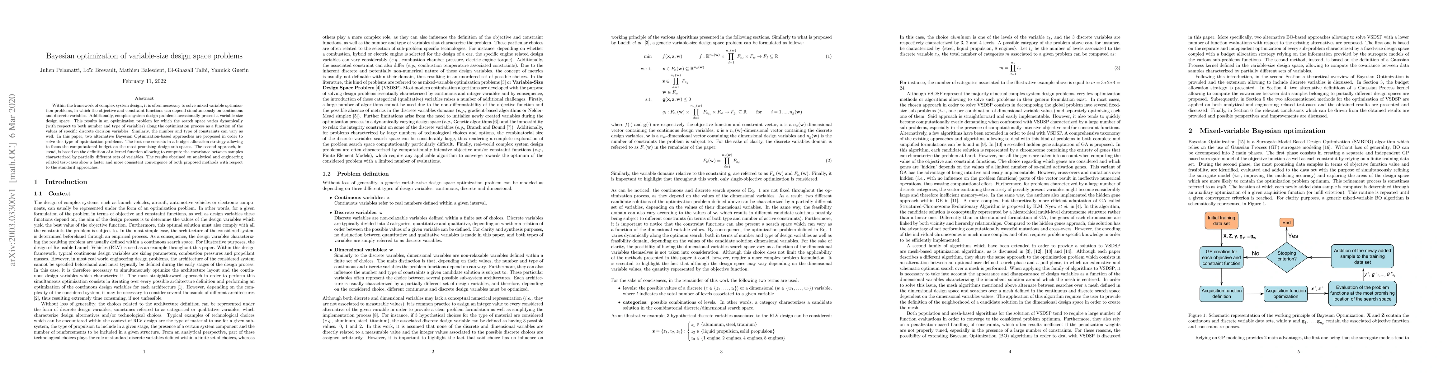 Within the framework of complex system design, it is often necessary to solve mixed variable optimization problems, in which the objective and constraint functions can depend simultaneously on continuous and discrete variables. Additionally, complex system design problems occasionally present a variable-size design space. This results in an optimization problem for which the search space varies dynamically (with respect to both number and type of variables) along the optimization process as a function of the values of specific discrete decision variables. Similarly, the number and type of constraints can vary as well. In this paper, two alternative Bayesian Optimization-based approaches are proposed in order to solve this type of optimization problems. The first one consists in a budget allocation strategy allowing to focus the computational budget on the most promising design sub-spaces. The second approach, instead, is based on the definition of a kernel function allowing to compute the covariance between samples characterized by partially different sets of variables. The results obtained on analytical and engineering related test-cases show a faster and more consistent convergence of both proposed methods with respect to the standard approaches.