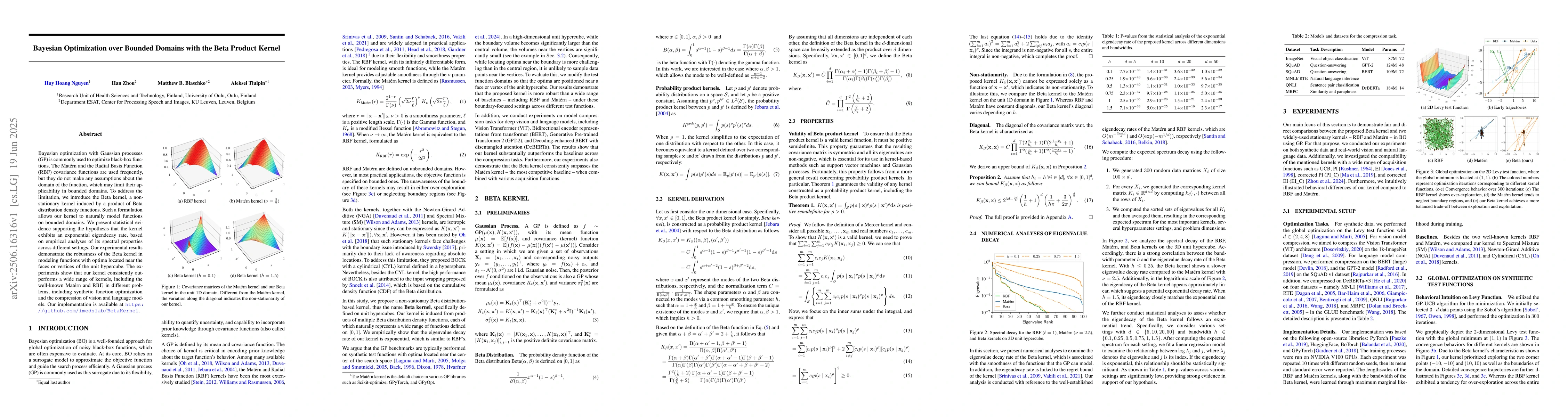 Bayesian optimization with Gaussian processes (GP) is commonly used to optimize black-box functions. The Mat\'ern and the Radial Basis Function (RBF) covariance functions are used frequently, but they do not make any assumptions about the domain of the function, which may limit their applicability in bounded domains. To address the limitation, we introduce the Beta kernel, a non-stationary kernel induced by a product of Beta distribution density functions. Such a formulation allows our kernel to naturally model functions on bounded domains. We present statistical evidence supporting the hypothesis that the kernel exhibits an exponential eigendecay rate, based on empirical analyses of its spectral properties across different settings. Our experimental results demonstrate the robustness of the Beta kernel in modeling functions with optima located near the faces or vertices of the unit hypercube. The experiments show that our kernel consistently outperforms a wide range of kernels, including the well-known Mat\'ern and RBF, in different problems, including synthetic function optimization and the compression of vision and language models.