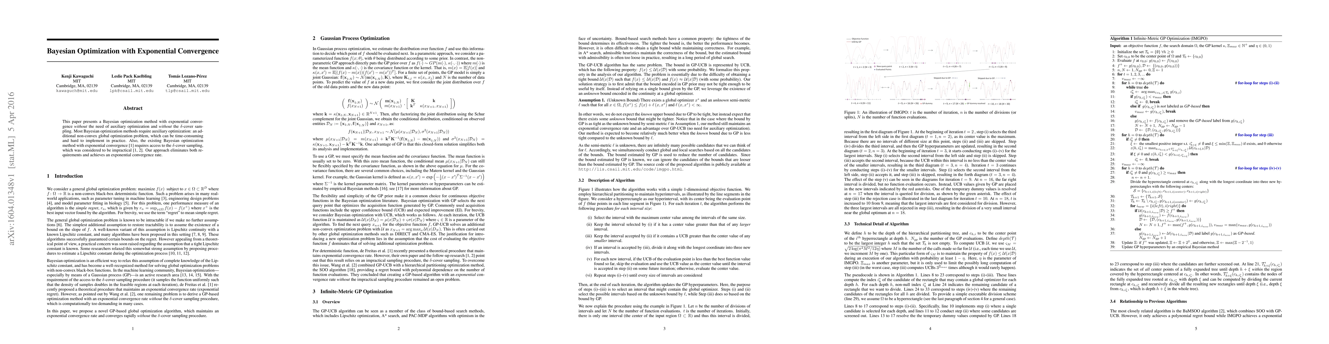 This paper introduces a novel Bayesian optimization method that achieves exponential convergence without auxiliary optimization or delta-cover sampling, addressing practical implementation challenges and improving efficiency. The proposed method eliminates the need for additional non-convex global optimization and impractical sampling techniques.