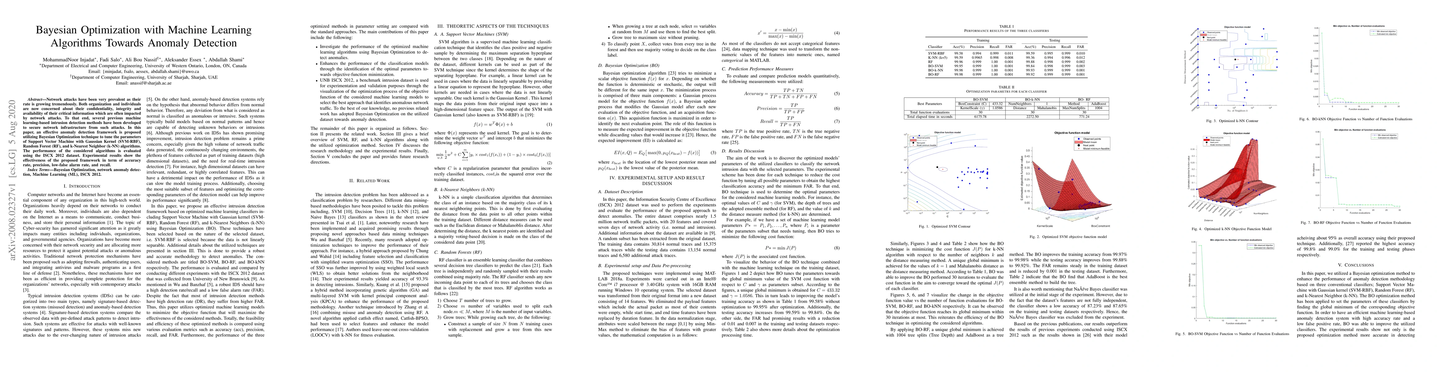 This paper proposes an effective anomaly detection framework using Bayesian Optimization to tune machine learning algorithms for network security, achieving high accuracy and low false alarm rates on the IXC2 2012 dataset.