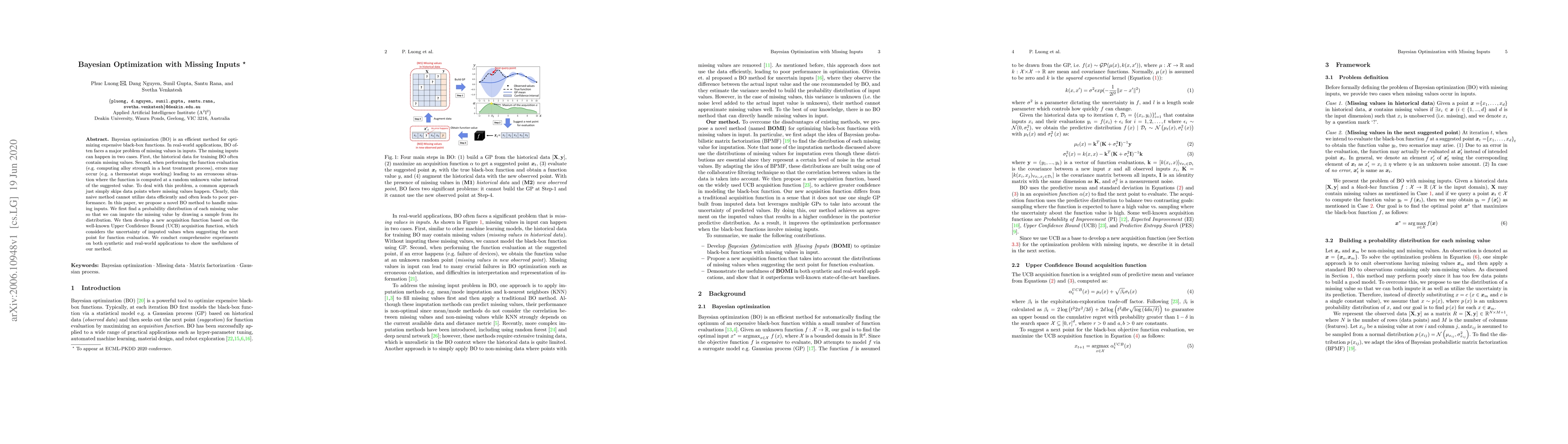 A new Bayesian optimization method is proposed to handle missing inputs in expensive black-box functions by imputing missing values with probabilistic distributions and considering uncertainty in acquisition function suggestions.