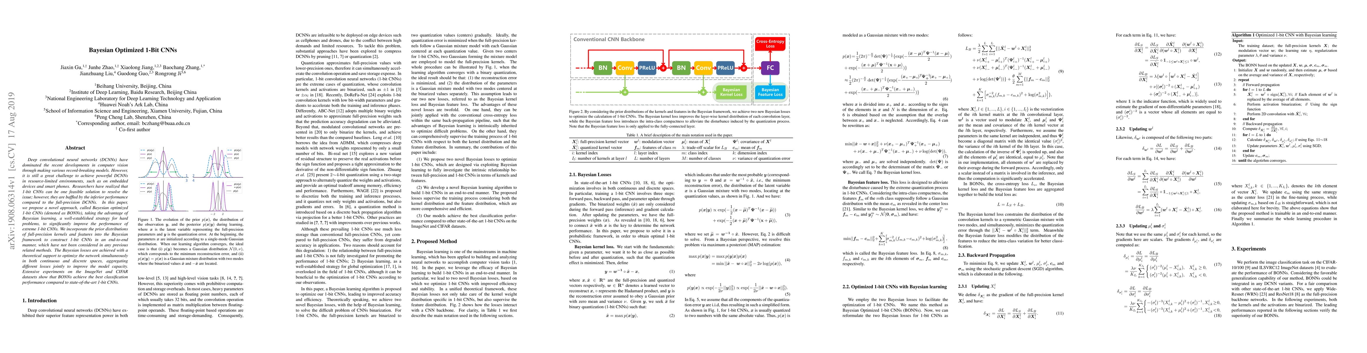 This paper proposes Bayesian optimized 1-bit CNNs (BONNs) to enhance the performance of resource-limited 1-bit CNNs by leveraging Bayesian learning. The method integrates prior distributions of full-precision kernels and features into the Bayesian framework to optimize the network in both continuous and discrete spaces, achieving superior classification performance on ImageNet and CIFAR datasets compared to other 1-bit CNNs.