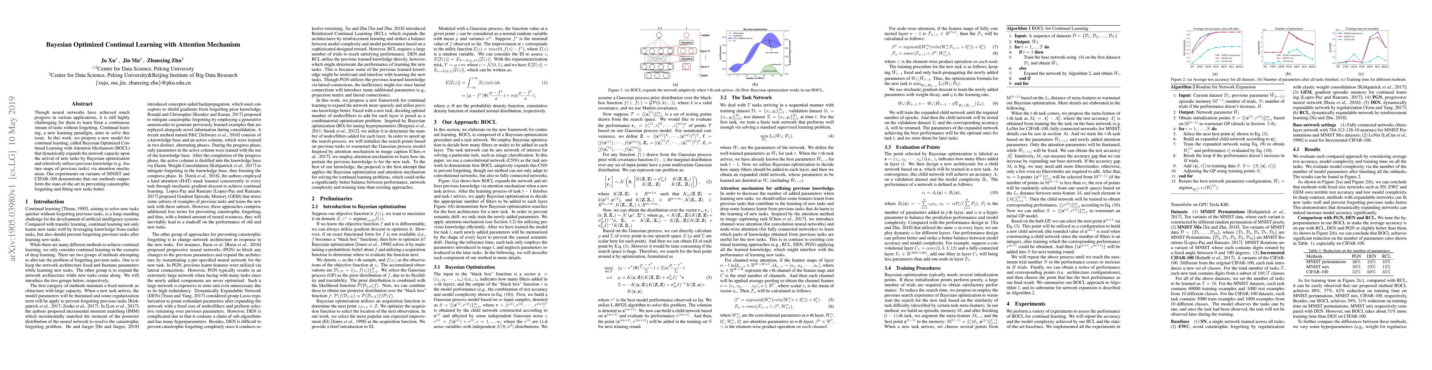 This paper introduces BOCL, a continual learning model that employs Bayesian optimization to dynamically expand network capacity and an attention mechanism to selectively utilize previous knowledge, achieving superior performance in preventing forgetting and adapting to new tasks compared to state-of-the-art methods on MNIST and CIFAR-100 datasets.