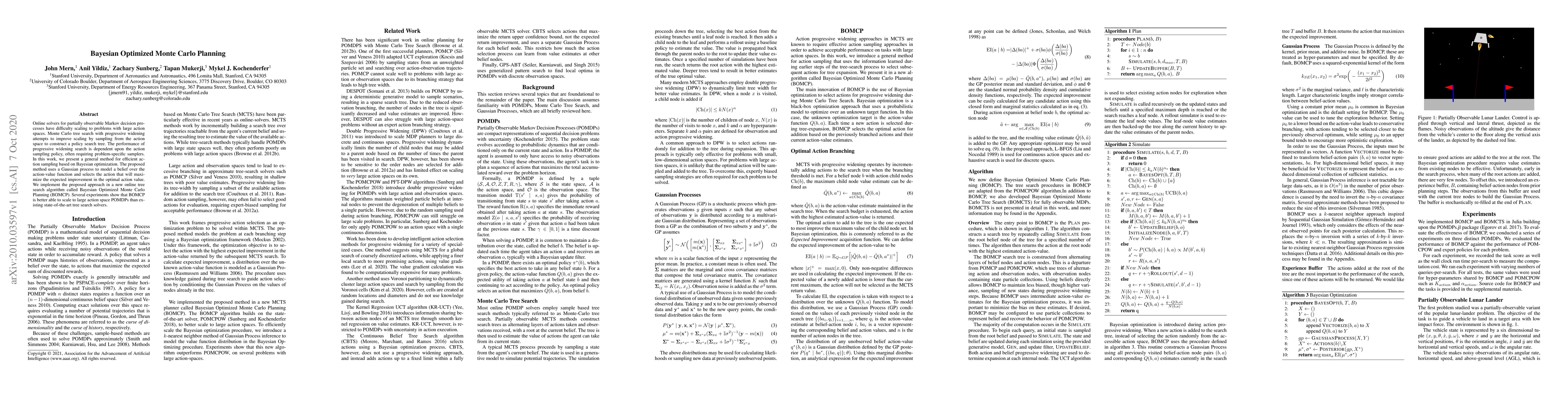 This paper introduces Bayesian Optimized Monte Carlo Planning (BOMCP), a novel online solver for partially observable Markov decision processes (POMDPs) that uses Bayesian optimization to efficiently sample actions. The method models the action-value function with a Gaussian process and selects actions that maximize expected improvement, demonstrating superior scaling to large action spaces compared to existing solvers.