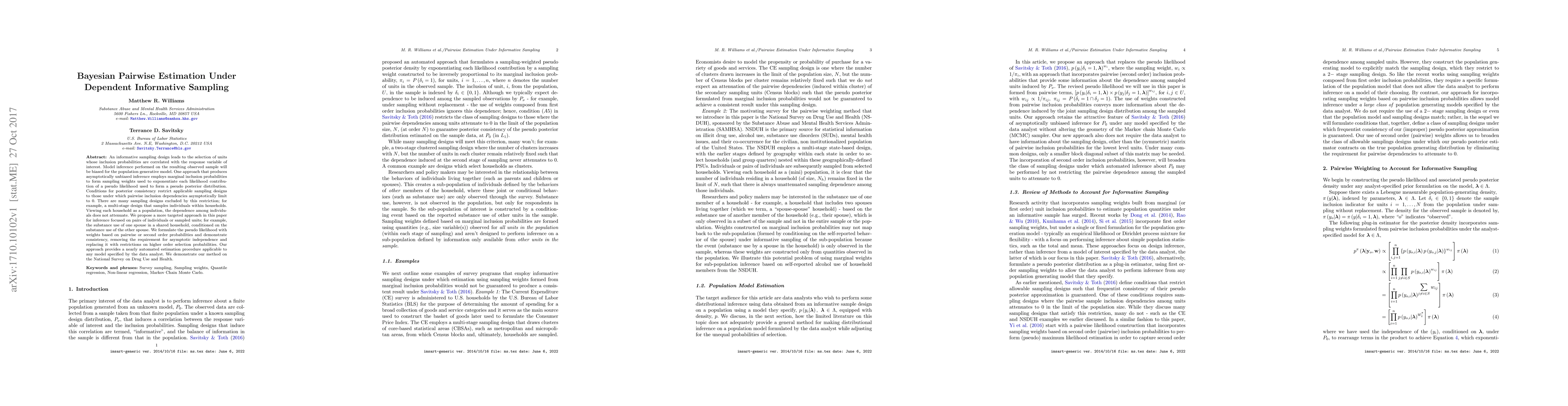 An informative sampling design leads to the selection of units whose inclusion probabilities are correlated with the response variable of interest. Model inference performed on the resulting observed sample will be biased for the population generative model. One approach that produces asymptotically unbiased inference employs marginal inclusion probabilities to form sampling weights used to exponentiate each likelihood contribution of a pseudo likelihood used to form a pseudo posterior distribution. Conditions for posterior consistency restrict applicable sampling designs to those under which pairwise inclusion dependencies asymptotically limit to 0. There are many sampling designs excluded by this restriction; for example, a multi-stage design that samples individuals within households. Viewing each household as a population, the dependence among individuals does not attenuate. We propose a more targeted approach in this paper for inference focused on pairs of individuals or sampled units; for example, the substance use of one spouse in a shared household, conditioned on the substance use of the other spouse. We formulate the pseudo likelihood with weights based on pairwise or second order probabilities and demonstrate consistency, removing the requirement for asymptotic independence and replacing it with restrictions on higher order selection probabilities. Our approach provides a nearly automated estimation procedure applicable to any model specified by the data analyst. We demonstrate our method on the National Survey on Drug Use and Health.