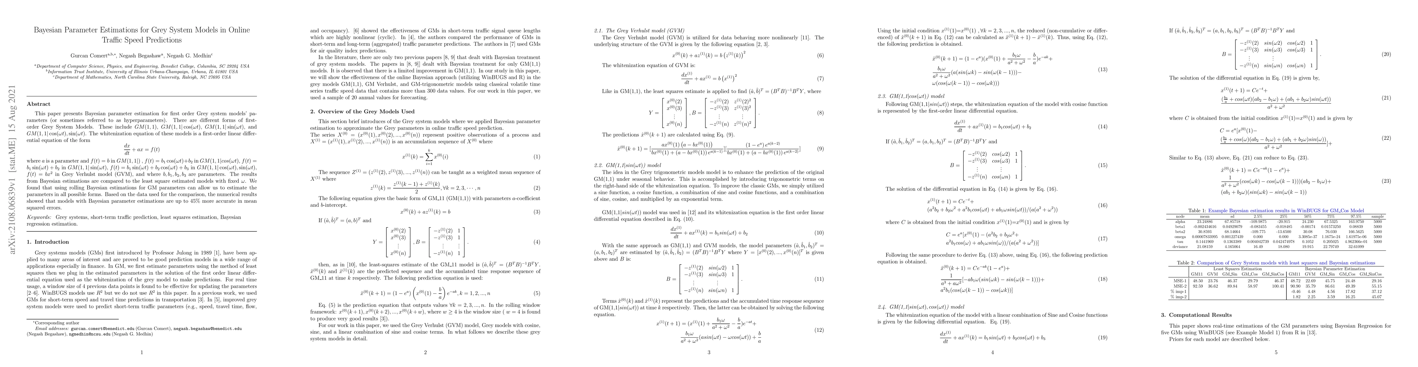 This paper presents Bayesian parameter estimation for first order Grey system models' parameters (or sometimes referred to as hyperparameters). There are different forms of first-order Grey System Models. These include $GM(1,1)$, $GM(1,1| \cos(\omega t)$, $GM(1,1| \sin(\omega t)$, and $GM(1,1| \cos(\omega t), \sin(\omega t)$. The whitenization equation of these models is a first-order linear differential equation of the form \[ \frac{dx}{dt} + a x = f(t) \] where $a$ is a parameter and $f(t) = b$ in $GM(1,1|)$ , $f(t) = b_1\cos(\omega t) + b_2$ in $GM(1,1| cos(\omega t)$, $f(t) = b_1\sin(\omega t)+b_2$ in $GM(1,1| \sin(\omega t)$, $f(t) = b_1\sin(\omega t) + b_2\cos(\omega t) + b_3$ in $GM(1,1| \cos(\omega t), \sin(\omega t)$, $f(t) = b x^2$ in Grey Verhulst model (GVM), and where $b, b_1, b_2$, and $b_3$ are parameters. The results from Bayesian estimations are compared to the least square estimated models with fixed $\omega$. We found that using rolling Bayesian estimations for GM parameters can allow us to estimate the parameters in all possible forms. Based on the data used for the comparison, the numerical results showed that models with Bayesian parameter estimations are up to 45\% more accurate in mean squared errors.