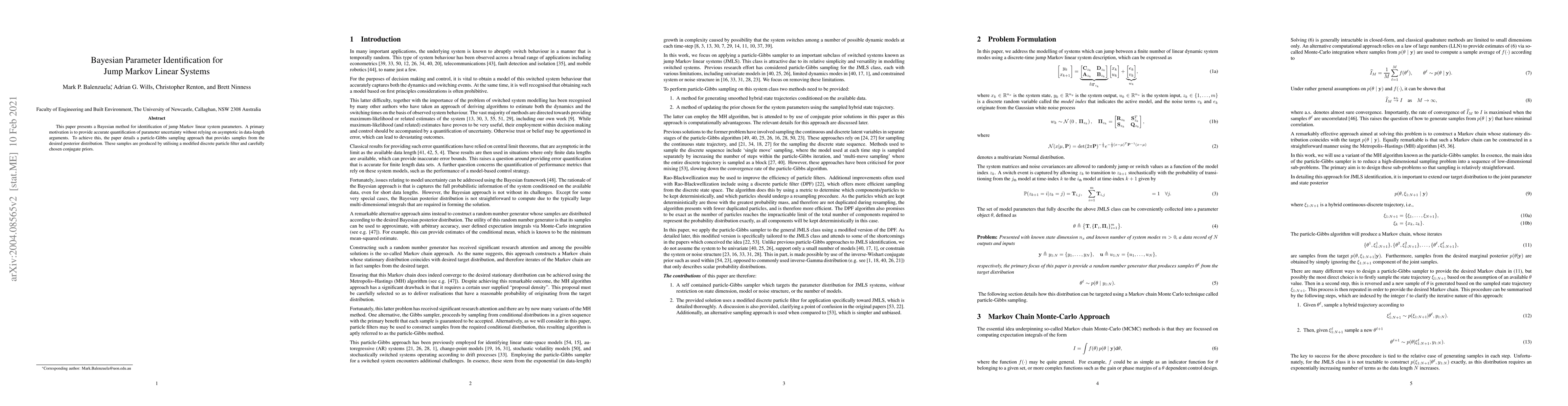 This paper introduces a Bayesian method for identifying parameters in jump Markov linear systems, employing a particle-Gibbs sampling technique to generate posterior samples without asymptotic assumptions. The approach uses a modified discrete particle filter and conjugate priors for accurate parameter uncertainty quantification.