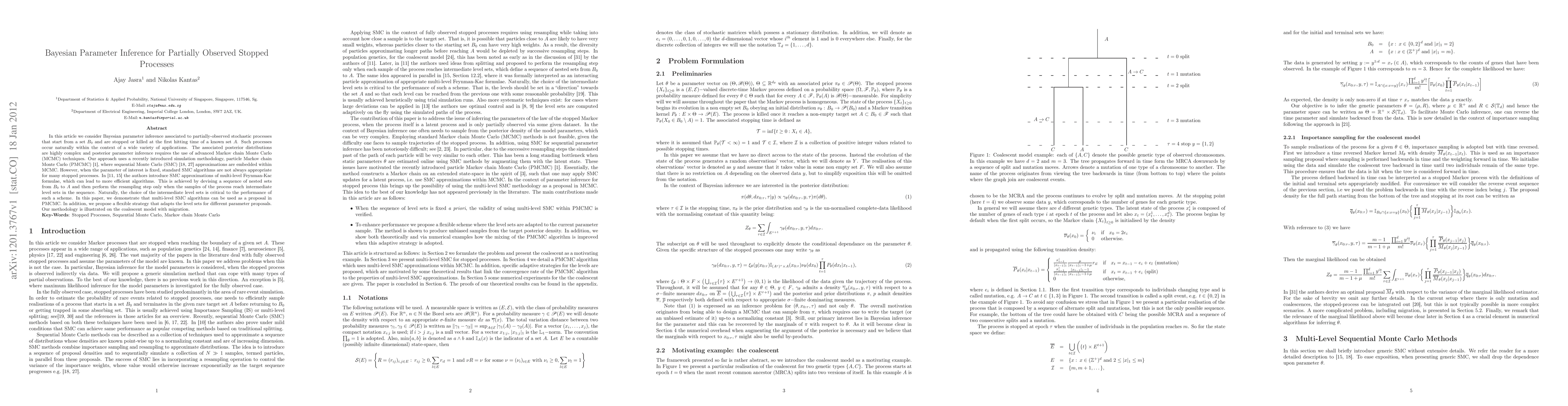 This paper explores Bayesian parameter inference for partially observed stochastic processes that are stopped upon reaching a specific set, employing advanced Markov chain Monte Carlo (MCMC) techniques. It introduces a particle MCMC approach that uses multi-level sequential Monte Carlo (SMC) algorithms to efficiently handle the complexity of posterior distributions, demonstrating its effectiveness on the coalescent model with migration.